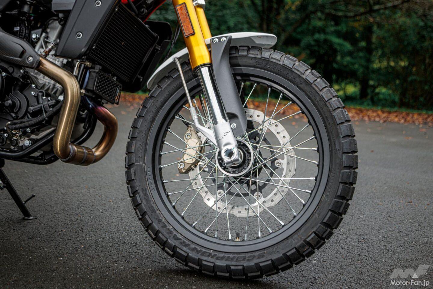 それを支えるのが、これまたNEWとなっている車体。簡単に言えばネック角を少し寝かせた、ということなのだが、加えてフォークのダンピングが見直されたためフロント回りに落ち着きがでた。先代モデルもこの方向に振ってあり、初期型のピョコタンとしたダンピングは改善されていたが、最新型ではさらにここに手を入れ別物のようにシットリ仕上げている。これによりオンロードも路面状況に左右されずにより積極的に走れるし、オフロードもかつてはちょっとフロント回りがクイックすぎて攻めきれないところがあったのが改善。真のスクランブラーとして、場面を選ばずにガンガン走れるようになったのだ。