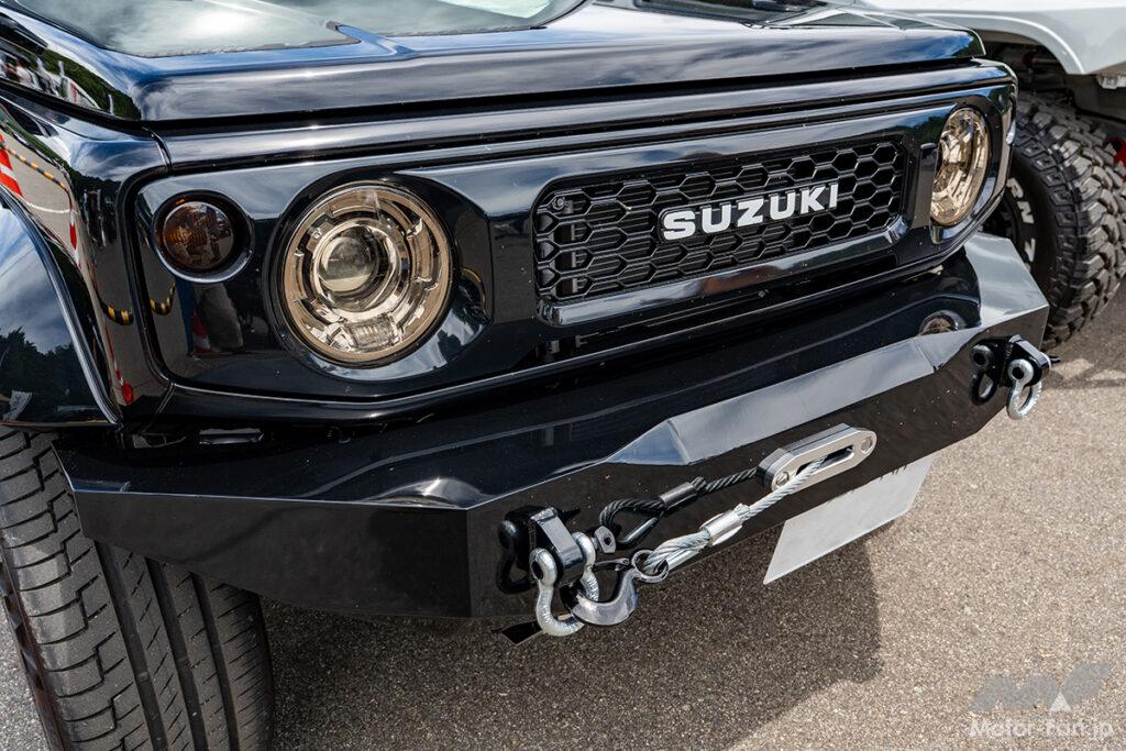 このクルマは、兵庫県のグローブタイヤのデモカー。様々なジムニーカスタムを行う同社が、ジムニーノマドにも着手。特筆するカスタムはアルミホイール。試作品のPCD変換スペーサーを取り付け、21インチホイールを装着。2インチローダウンで、かなりヤンチャでおしゃれジムニーに仕上がっている。新たなカスタムの提案とも言える仕様だ。