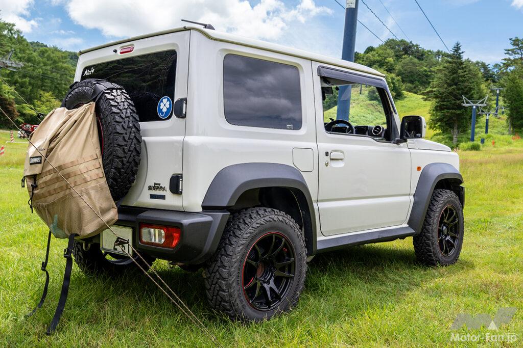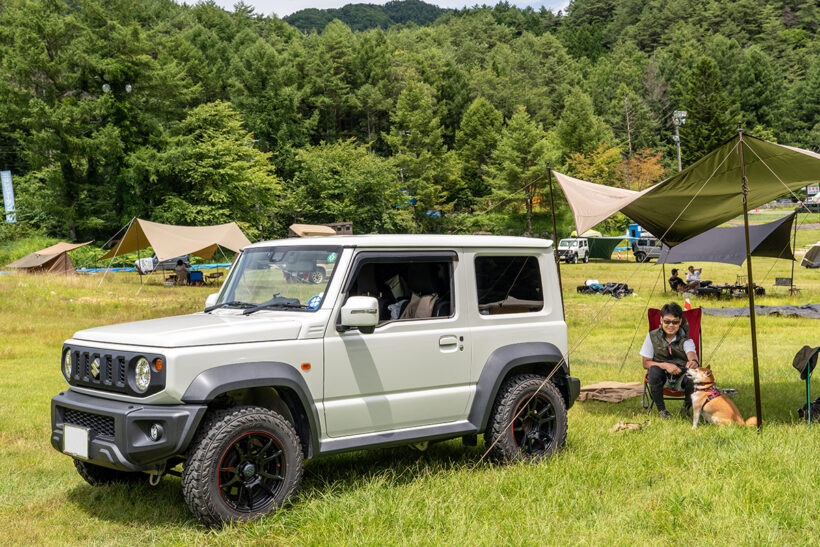 2018年7月に納車されたジムニーシエラの走行距離はすでに13万キロを超えるという鯉江さん。元々四駆系のクルマが大好きで、それまでハイラックスやランクル70などに乗ってきたが、コンパクトなボディサイズやそのスタイルに強く関心を抱いていたジムニーシエラを長い納車待ちを経てようやく入手。それからは、ロングドライブやキャンプなどに毎週のように出掛けているそう。あまりのキャンプ好きに、三重県のキャンプ場が定額で何度も利用できるサブスク会員になるほどだ。カスタマイズはホイール交換だけだが、とにかくジムニーの仲間同士が集まるイベントやオフ会が大好き。今回のイベント後も、ジムニーオーナーを集めたキャンプイベントに参加予定するなど、とにかくアクティブなオーナーさんでした。
