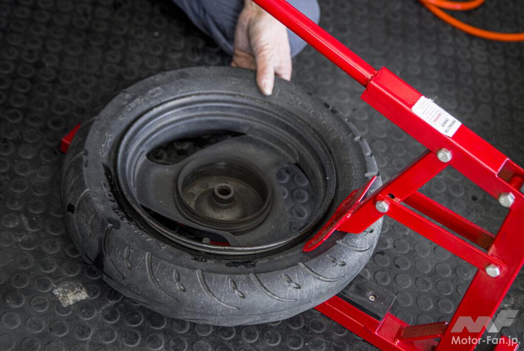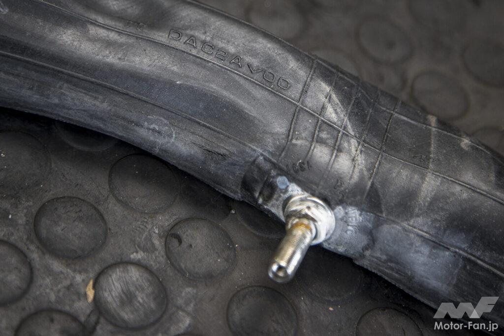 じつは以前、一時停止からの発進時にリヤタイヤからブシュッと空気が前抜けしたことのあったJOGアプリオ。コンプレッサーで空気を充填し直すと、それっきり漏れることがなかったので、エアバルブのゴムでも劣化したのかなとなんとなく思っていました。タイヤの溝も無くなってきたので、機を見てタイヤとエアバルブを交換しようと、新品は用意していましたが……。