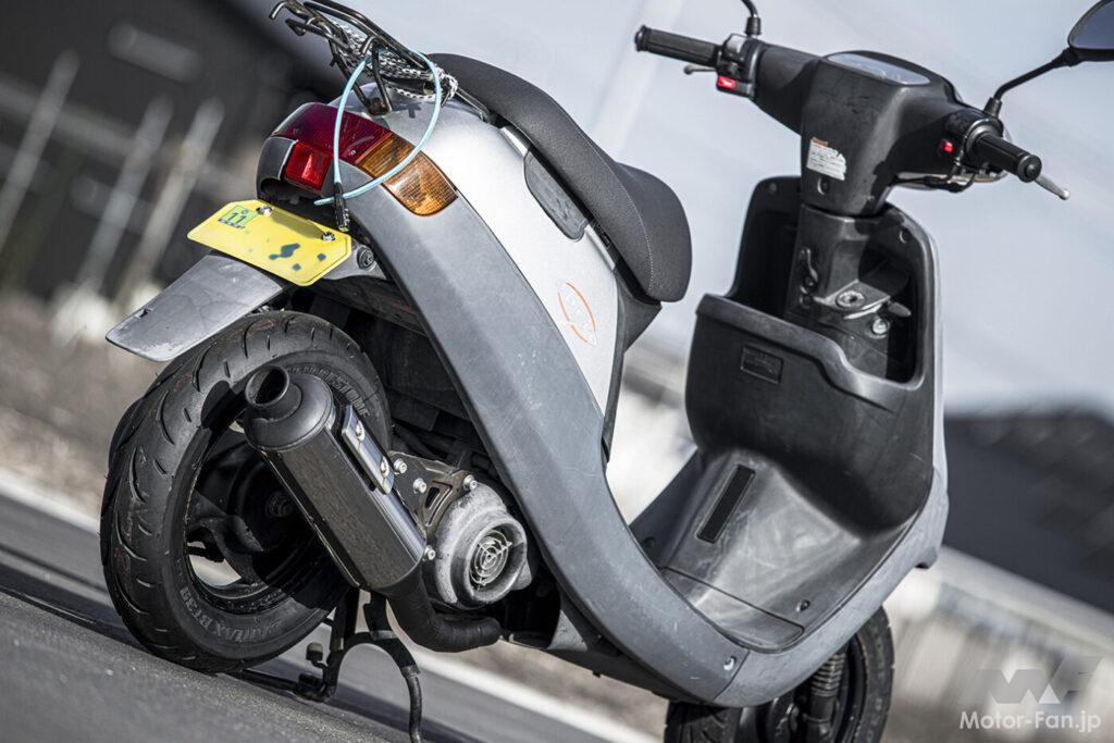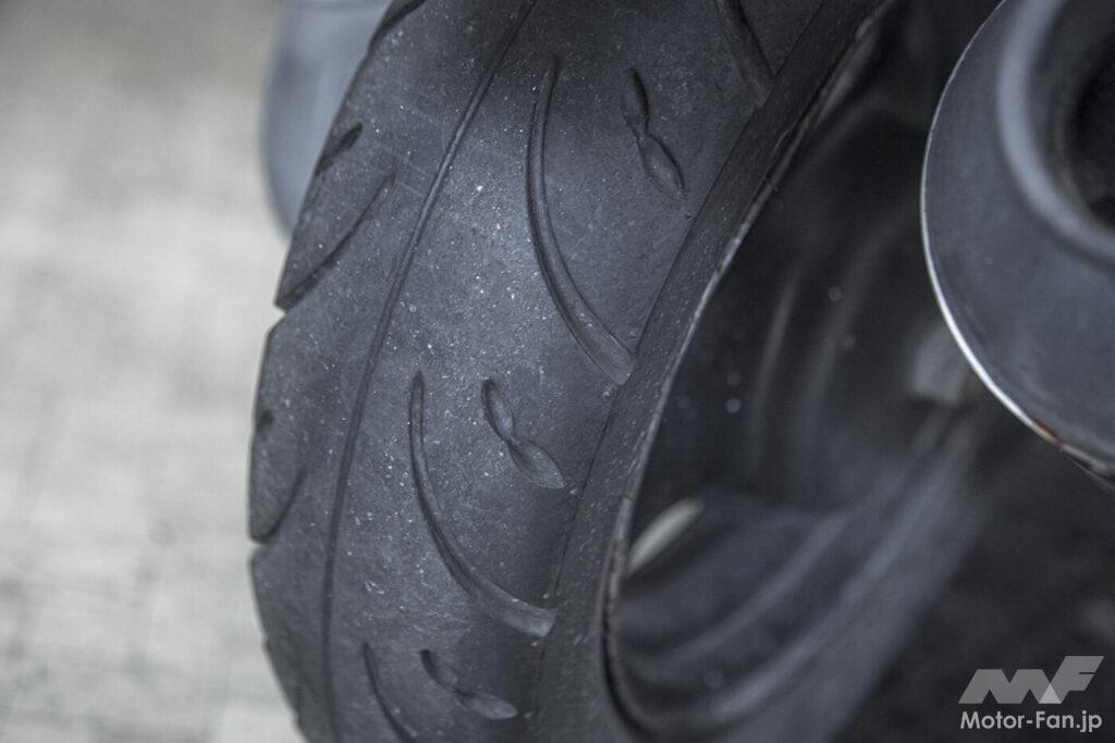 ダンロップD307(90/90-10)から3.50-10サイズへの変更によって、タイヤの直径が大きくなり、クランクケースとの隙間が少しに。最高速が100km/hにも満たない筆者のアプリオなら、干渉する心配はなし。