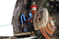 また、年式的にも不安になってくるハブ&ブレーキ周辺も抜かりなし。フロントサスペンションは、S15シルビアやR32スカイラインのパーツを組み合わせながら移植している。