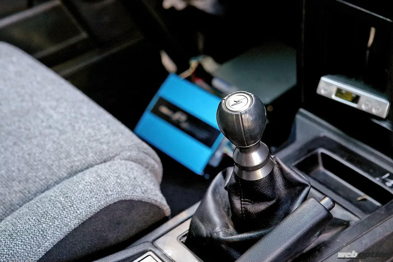 エンジン換装と同時に、ミッションもS15シルビア用の6速を搭載してギヤ比を最適化。アピールする意味も込めて(!?)シフトレバーもシルビア純正を使っている。
