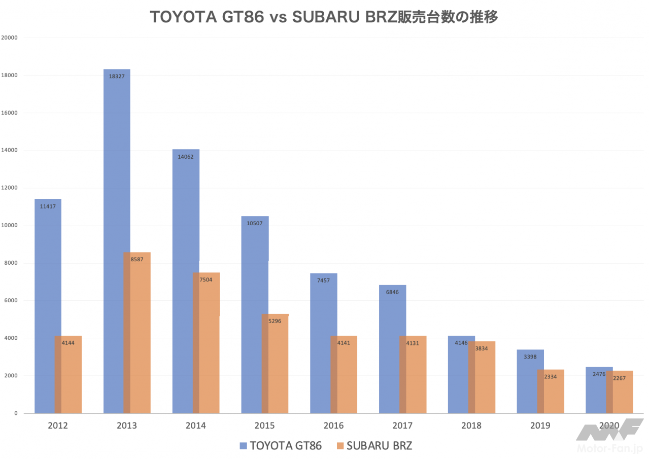 両モデルとも、2013年をピークに販売台数は減少。前年を超えたことはなかった。2020年は86が2476台、BRZが2267台。前述したスバルはトヨタの3割だとしたら、BRZの人気を維持し続けたと見ることもできる。