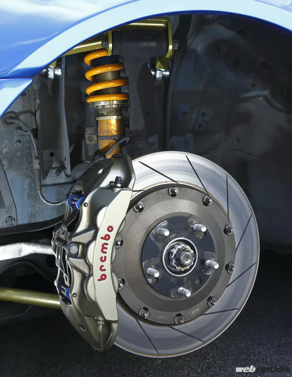 足回りはオーリンズ車高調で、スプリングレートはフロント12kg/mm、リヤ10kg/mmを選択する。アーム類はリフレッシュも兼ねてイケヤフォーミュラの調整式アームに交換。これらのアップデートによって軽快な走りが蘇ったそうだ。