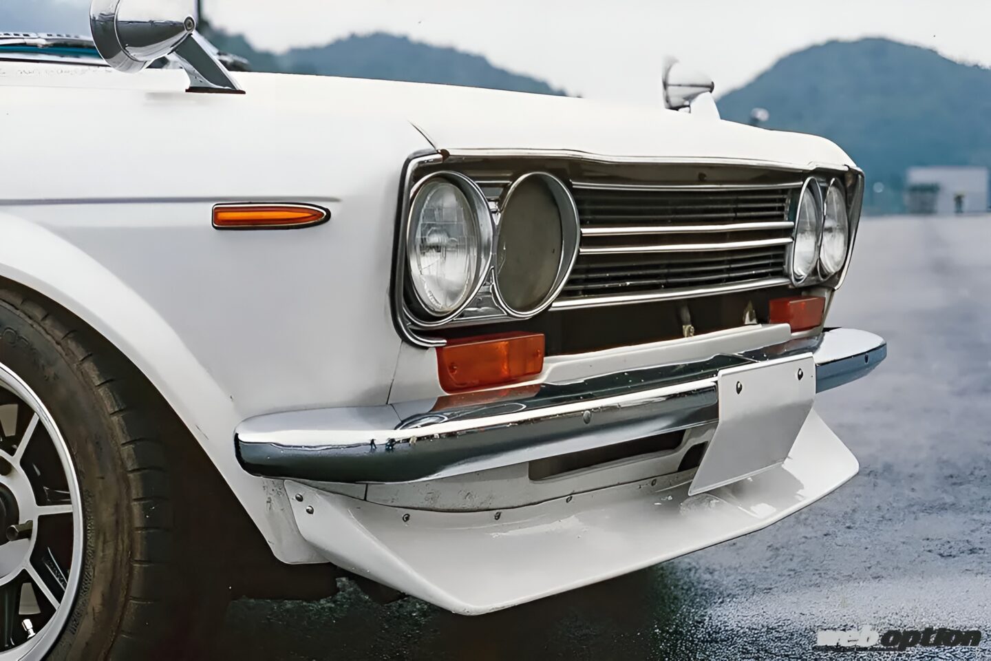 チンスポイラーはハコスカ用をベースに加工したもの。さらにライトを1つ潰してエアダクトとするなど、510ブルが現役だった当時の定番カスタムを再現しているのだ。