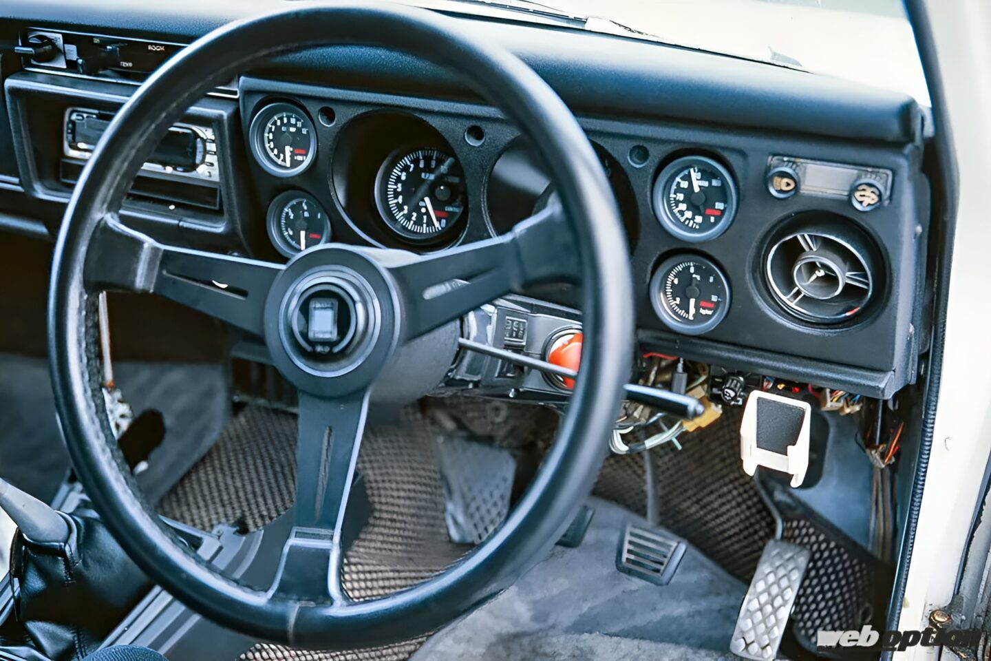 足回りも独特だ。フロントはR30スカイライン用のストラットを流用し、ダンパーはAE92用のTRDショート。ブレーキキャリパーもR30用を使っている。リヤショックにはTRDのAE86用を装備。ブレーキは純正ドラムのままとされている。