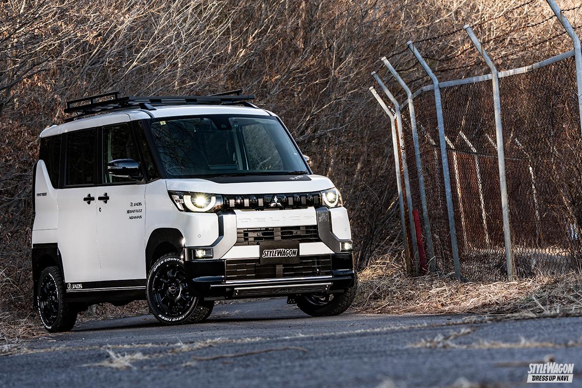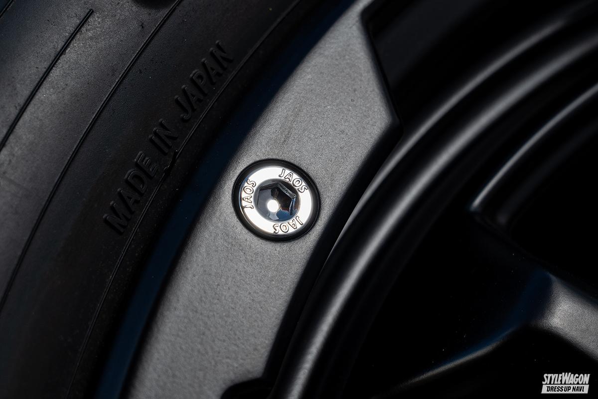 四駆カスタム界のエキスパート、ジャオスは、ボディや足まわりなどのほか、ホイールも積極的に展開している老舗ブランド。デリカミニが履くアダマスは、シティ四駆向けとして安定した人気を博す、ジャオスホイールの2枚看板のうちの1つだ。最大のニュースはそのサイズで、ジムニーを除くK用として、しかも車種専用として展開するのは、ジャオスの長い歴史のなかで今回が初とのこと! ちょいゴツめなスポークやビードロック風のリムといった、評価されているアダマスの意匠性はそのままに、純正フェンダーのデリカミニにちょうど良くキマるようリサイズしている。もちろんマッチングはドンピシャで、ハブリングを用意する必要もナシ。ホワイトレタータイヤとの相性もバツグンだ。