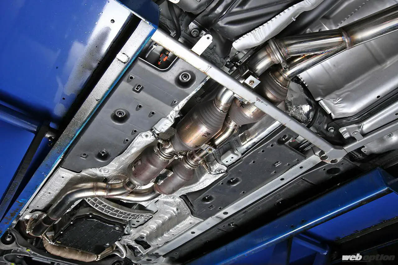本来、EXマニ部に設けられている第一触媒は、ターボ設置にともない中間部へと移設。これにより車検対応を実現している。エンドマフラーは上品なオーバルデュアルテールが特徴のアドミレイションLS-Dをセット。スピードリミッターカットにはVACが使用されている。