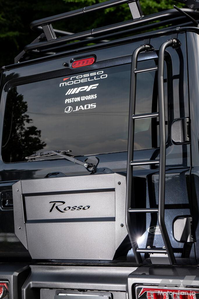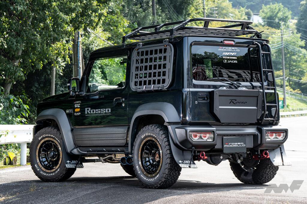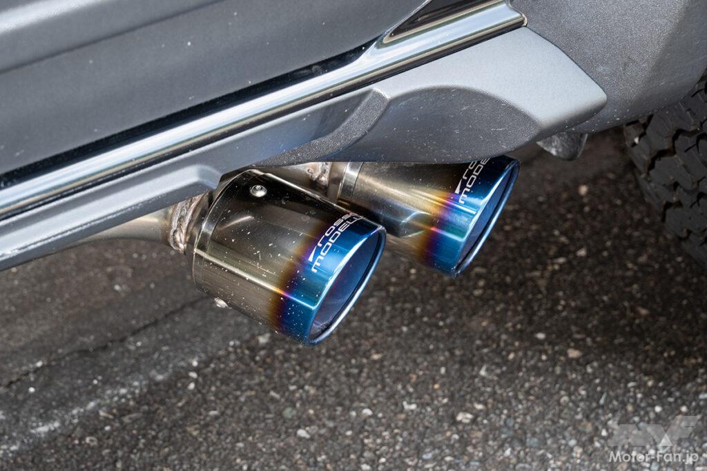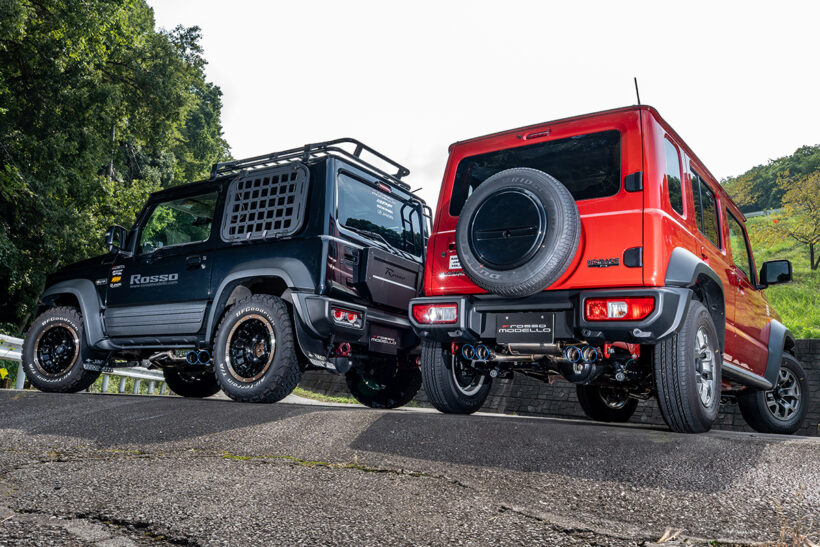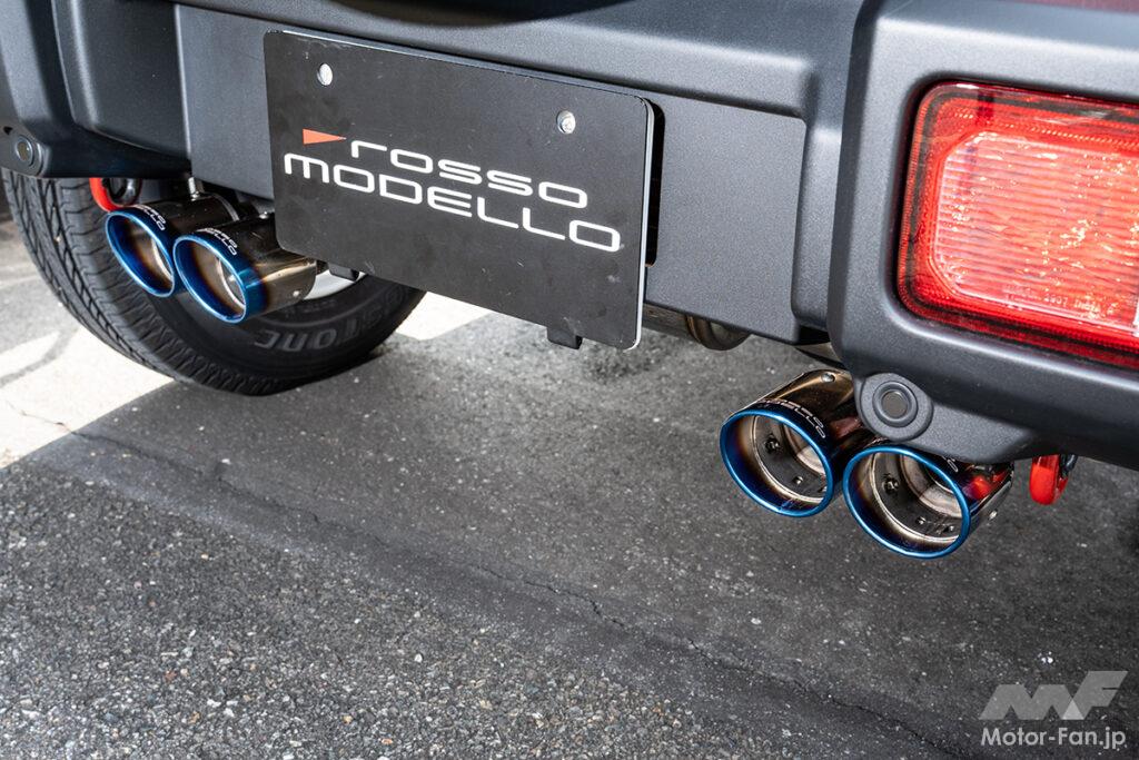 また、ロッソ モデロのマフラーはしっかりとトルクが得られているため、走りも申し分なし。だからこそ装着による満足度も高いのだ。特に、カスタムビギナーであれば、その変化は優越感にも繋がるだろう。だが、ここで新たな問題がまたも現れる。4本出しにすべきか、サイド出しにすべきか、という問題だ。今回のデモカーでは4本出しは新作のノマド用で撮影しているが、もちろんJB64/74ジムニー&シエラ用もラインアップあり。対してサイド出しはJB64/74ジムニー&シエラ用となっている。リアのインパクトを重視するか、フロント・サイド・リアどこからでも見える他にはない存在感を取るか。それによって選ぶしかないのかもしれない。
