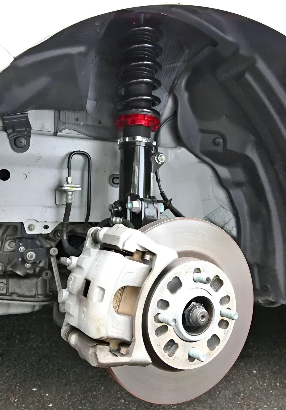足回りはラルグス車高調でセットアップ。ブレーキはキャリパー&ローターともにノーマルで、パッドのみディクセルの強化品に交換される。