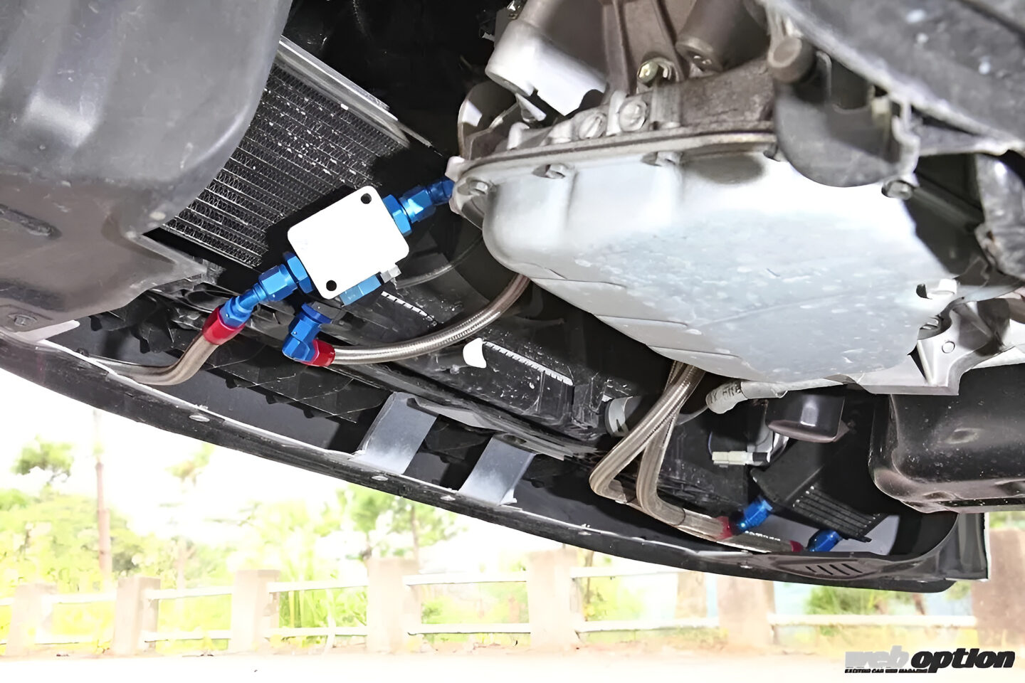 フロントバンパーの奥に装着されるのは、右側がエンジンオイルクーラー、左側がCVT用のミッションオイルクーラー。これで、パワーアップによる油温の上昇やCVTの滑りを抑えている。