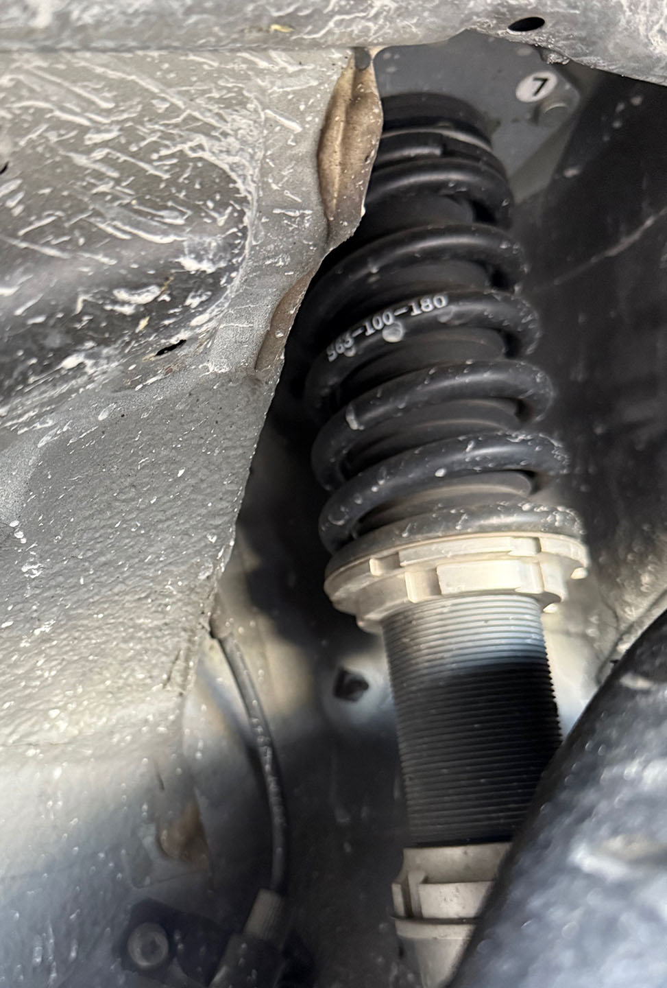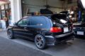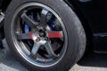車高調はピットロードM製。パワーアップに合わせて今回、エンドレスの4ポッドキャリパーをフロントに装着し、16インチホイールの仕様を前提に280mmローターを選んだ。