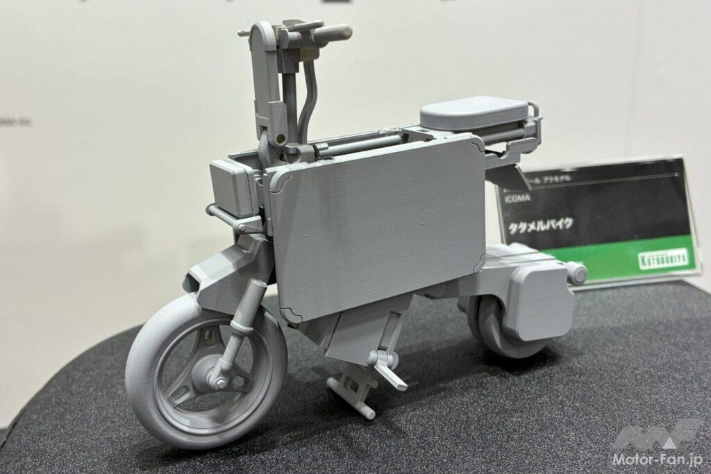今回のホビーショーのダークホースがコトブキヤ。同社はキャラクター・モデルや美少女フィギュアモデルなどで有名ですが、美少女フィギュアモデルの小道具的なスタンスで1/10スケールのモトコンポの発売を、また、「現代版モトコンポ」と呼ばれるICOMAタタメルバイクの開発がアナウンスされました。