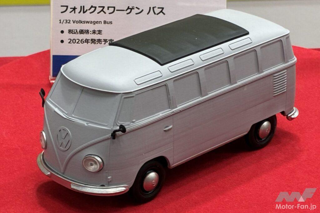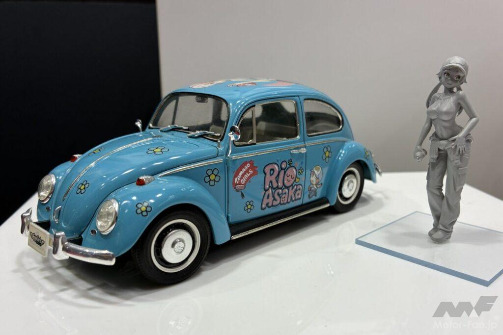 アオシマのブースは今回も多ジャンルの展示が充実。人気の『LBWK』シリーズの新製品や定番の『ザ・チューンドカー』シリーズのシャシーのリニューアルなどが話題となるなか、特に注目されたのは塗装不要・スナップフィットの『楽プラ』シリーズの拡充で、フォルクスワーゲン バスやフェラーリ 512 BB、軽トラックのダイハツ ハイゼットなど、子供からライトユーザーまで手に取りやすいラインアップが発表されました。塗装不要ながら色違いでコレクション性を高める動きが見られます。また、『MF GHOST』などのキャラクター系自動車プラモなど、幅広いファン層取り込みを意識しています。会場配布物やグッズ(あおこバッグ等)を使った来場者向け施策も好評を博していました。