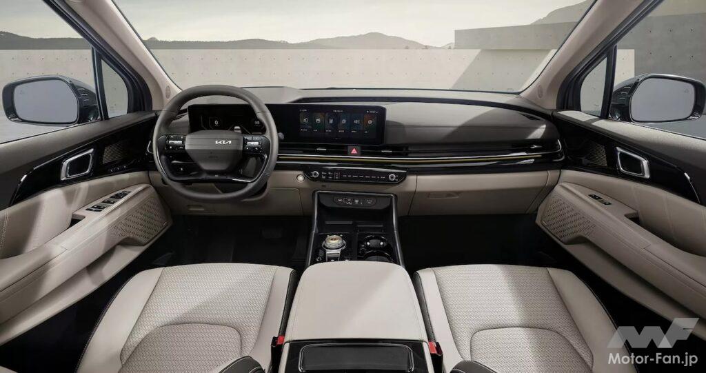 2列または3列のシートレイアウトは、4人乗り、7人乗り、9人乗りから選択可能となっている。最高級グレードである4人乗りの「Signature」(シグニチャー)は、最も贅沢なシートで、後部キャプテンシートには格納式フットレスト、リクライニング式バックレスト、そして疲労回復のためのマッサージ機能が備わっている。さらに、フットマッサージャーと専用のシューズ収納スペースも備えているなど、キア史上最もラグジュアリーなモデルといっていいだろう。