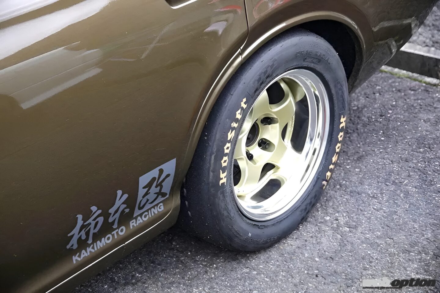 タイヤはフロントがヨコハマアドバンA050(185/55-15)で、リヤがフージャーのドラッグラジアル(225/50-15)という組み合わせ。なお、リヤに関してはナローボディ仕様ではレースタイヤを収めることは難しいため、ホーシングを片側80mmカットして内側に押し込んでいる。