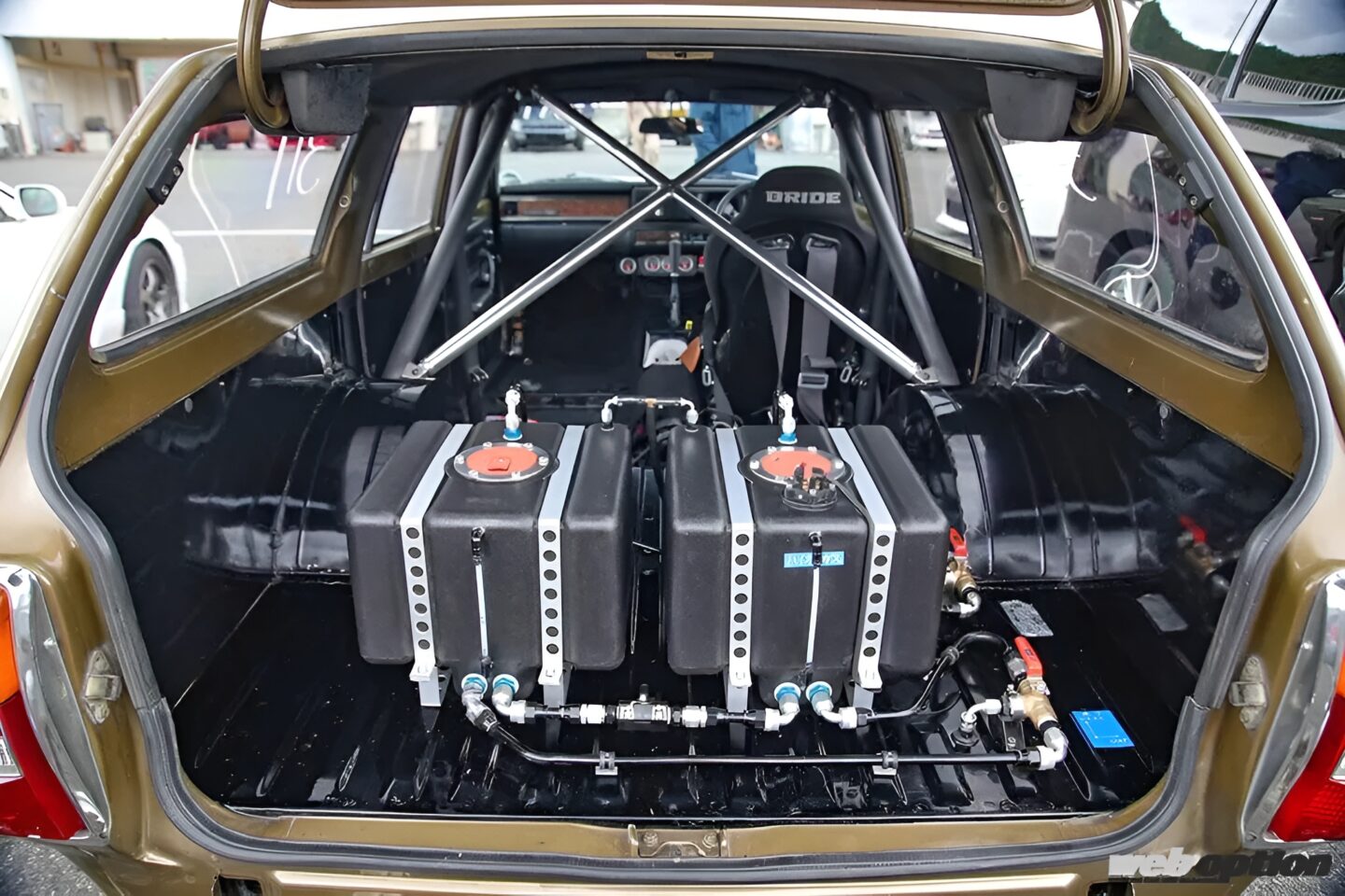 基本はドラッグレース仕様だが、公道もストレスなく走れるようにと、室内にはレースガス専用と市販ハイオク専用という2系統の安全タンク&フューエルラインを設置。切り替えはシンプルな手動のボールバルブが担う。