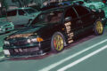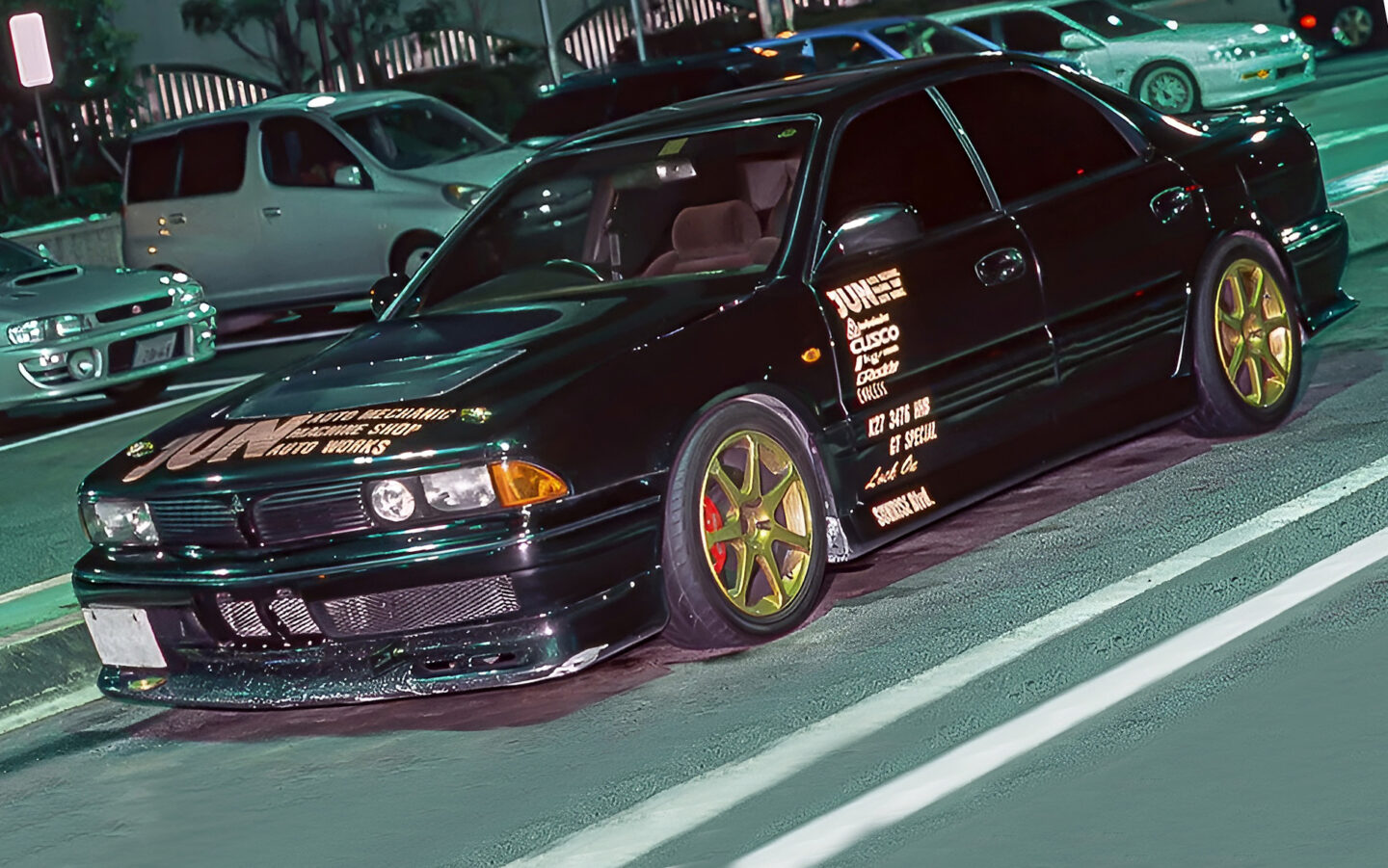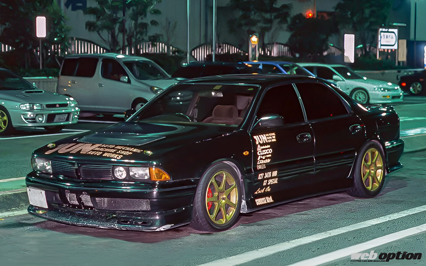 FFで500psという驚異のスペックを誇る漆黒のディアマンテ。飛び石により剥がれたバンパーの塗装が、このチューンドの戦歴を物語る。そもそもF17A型ディアマンテが出た当時はバブル絶頂期で、各メーカーからハイエンドセダンが続々登場したタイミングでもある。オーナーはセルシオを買おうと思っていたそうだが、納車7ヶ月待ちと言われたため、即納可能だったディアマンテを選んだという。