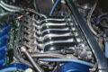 インマニにずらりと並ぶ追加インジェクターがそのパワーを物語る。容量はメインは350cc×6、追加も350cc×6、さらに550ccが1本入る。コントロールはPFC F-CONでベースの燃調を制御し、レビックのプライマリーで追加6本を、セカンダリーで550ccインジェクターを制御。各バンクからEXマニを伸ばし、バランスパイプもあるためエンジンルームのスペースは一杯一杯。しかもこのEXマニ、かなりの頻度で割れてしまうという。