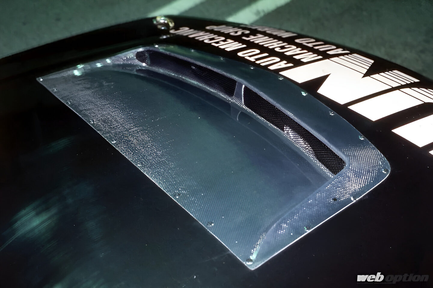 超ハイパワーユニットをギッチリ詰め込んだエンジンルームのため、ボンネットのダクトは必須パーツ。フロントバンパーから導入したエアを強制的に引き抜くのだ。