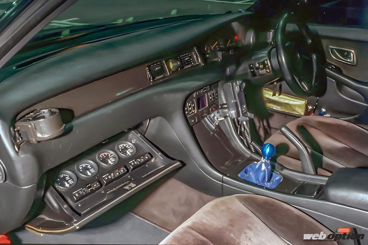 重厚なシートが高級車の面影を伝える。ミッションは3.0Lエンジン用にはオートマしか設定がなく、500psオーバーに耐えられるわけがない。そこで、2.5Lモデル用に設定されていた5速マニュアルを流用している。一時、軽量化のためにリヤシート等を外していた時期もあったが、首都高のバンピーな路面ではリヤが跳ねてしまうようになったため、元に戻したという経緯がある。