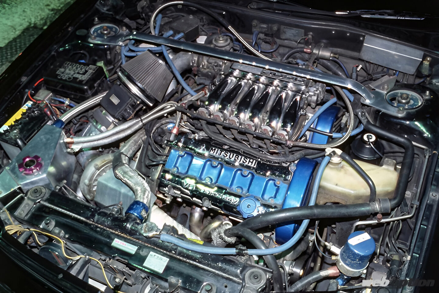ベースエンジンはV6で2972ccの6G72。これにGTOの91.6φ純正オーバーサイズピストンを組み込んで3005ccとし、カムも純正加工でハイリフトを製作した。ターボ化を前提にエンジンを強化したのである。