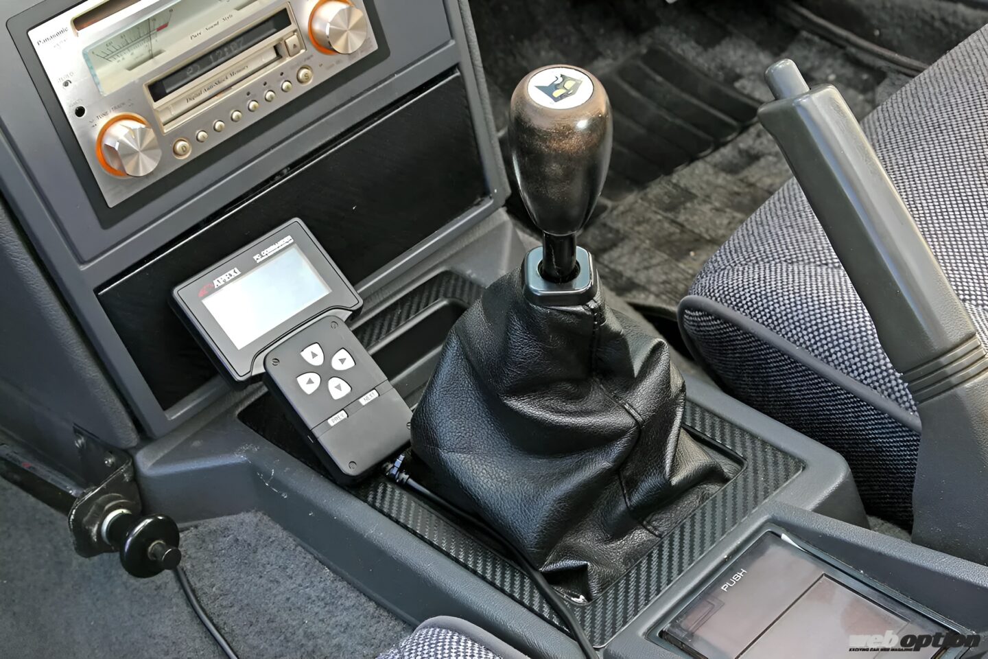 マーシャルのウッドシフトノブや、アナログ風デザインのパナCQ-VQ5500がインテリアを盛り上げる。助手席側に見えるボタンのようなものは、ECV(マフラーを消音するバルブ)のトリガーだ。なお、エンジンはER33のものだが、ミッションにはBNR32用5速MTを、リヤデフにはR31用のR200をそれぞれ流用し、駆動系も強化済みだ。