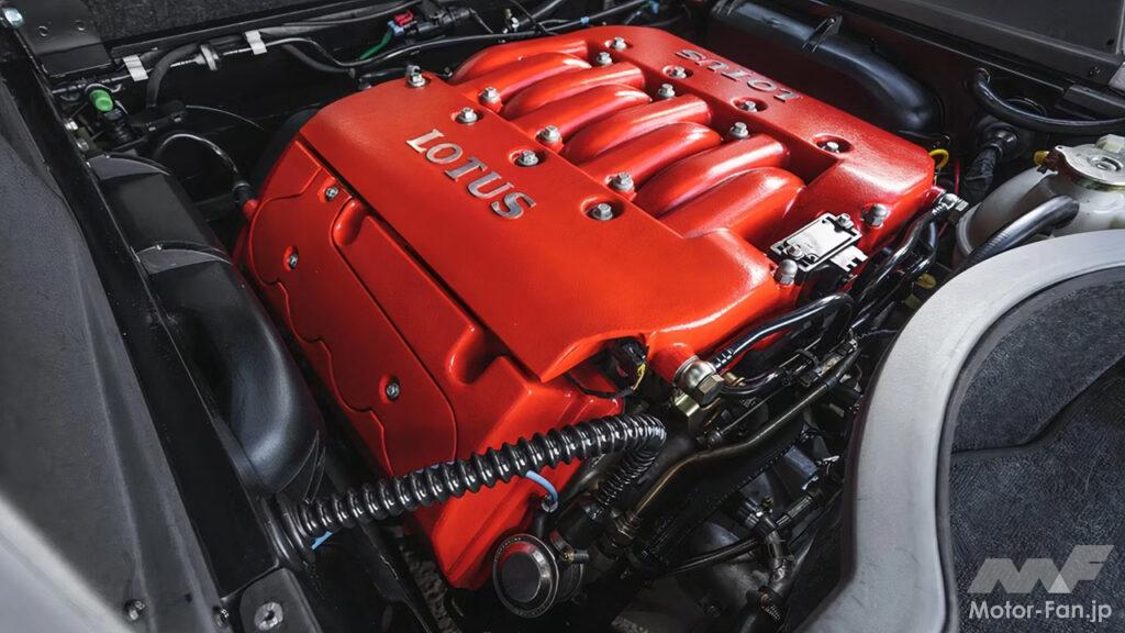 ドナーエンジンは、1996年に導入され、2004年に生産終了となるまで使用されたエスプリV8エンジンだ。ロータス独自のエンジンである3.5L V8ツインターボはフラットプレーンクランクを採用し、1996年のデビュー時には355PSを発揮した。