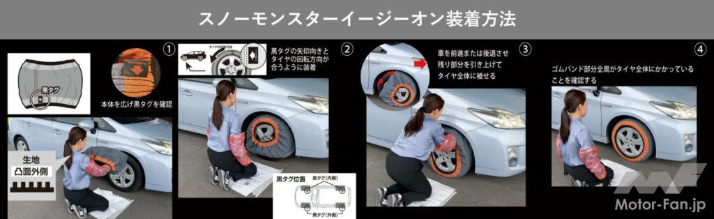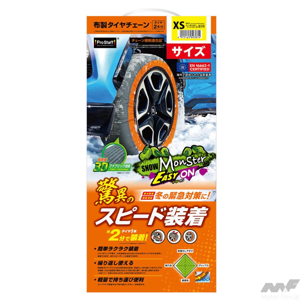 プロスタッフの『スノーモンスター イージーオン』は、タイヤに被せるだけで簡単に装着ができる布製タイヤチェーン。同社のデータによるとタイヤ1本あたり約2分で取付作業が完了し、突然の雪にも素早く対応ができる。