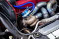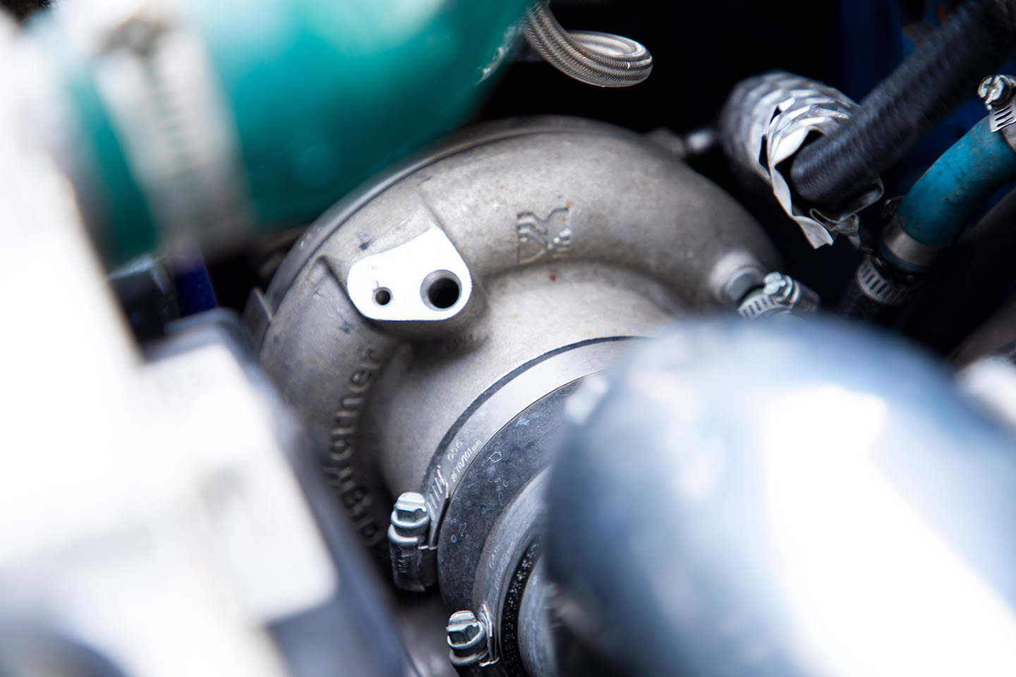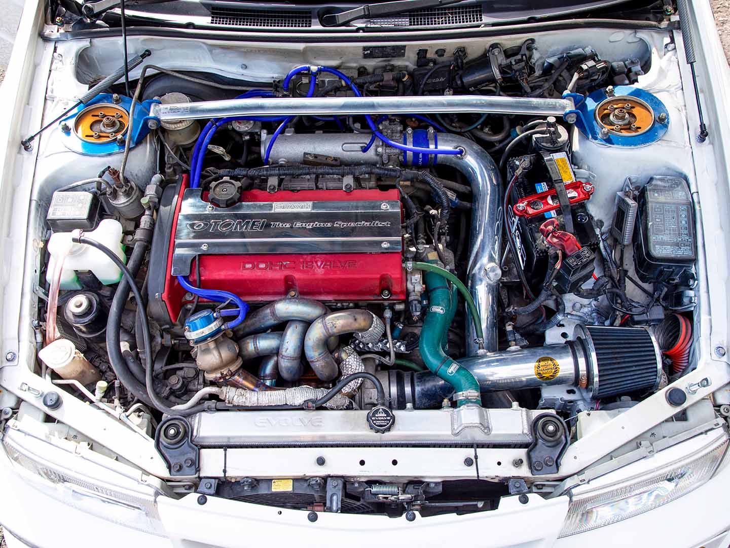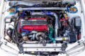 タービンキットはGCG製の4G63用を使用しているが、本来はエアコンレス仕様向けのため、エアコン付きでも取り付けられるように改良済み。特にウエストゲート周りのレイアウトは大幅に変更され、実質的にワンオフに近い取り付けとなっている。
