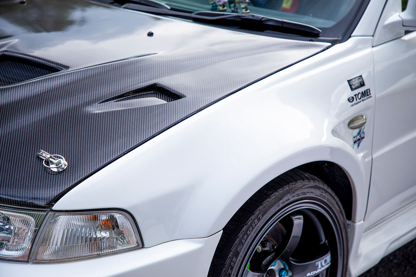ボンネットダクトの純正ネット部が製廃になっていたため、補修を兼ねてボンネットをカーボン製に変更している。