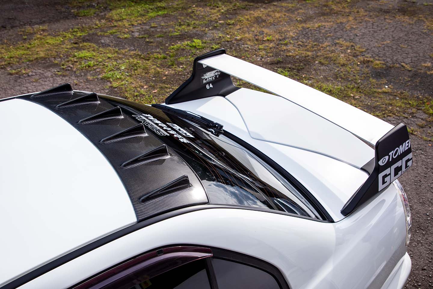 ルーフ上のボーテックジェネレーターは、カーボンボンネットの素材感に合わせてカーボン製をセット。純正ウイングの塗り分けも統一感を高めている。