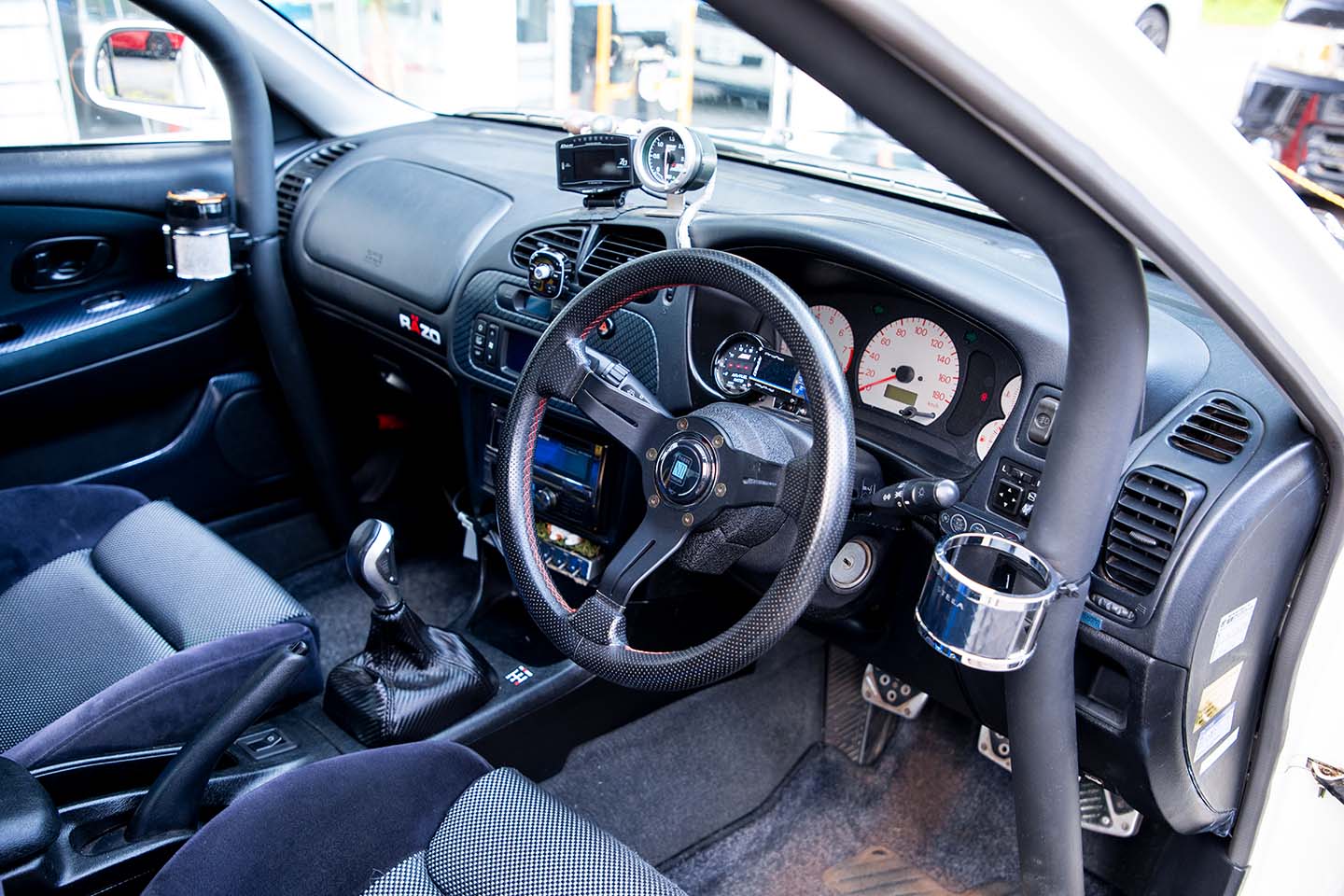奥さんも安全に乗れるよう、ロールケージでキャビンスペースはしっかりと保護。追加メーターなども見やすさを優先して配置。コラム上にはA/F計を設置、その隣にはグレッディのプロフェックe-01を並べ、ブースト圧など必要情報をモニタリング。