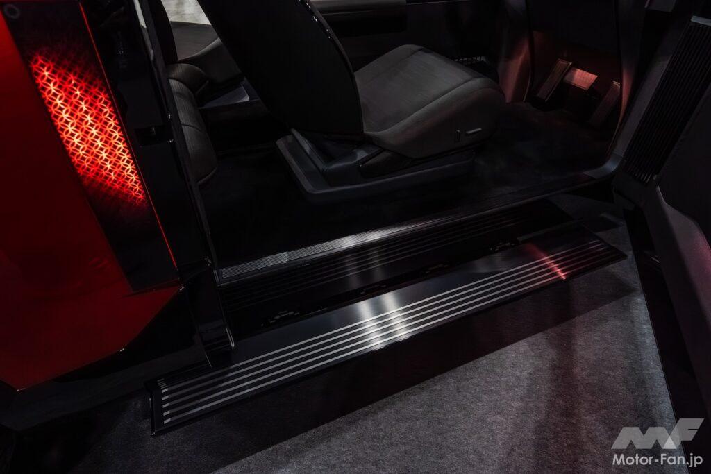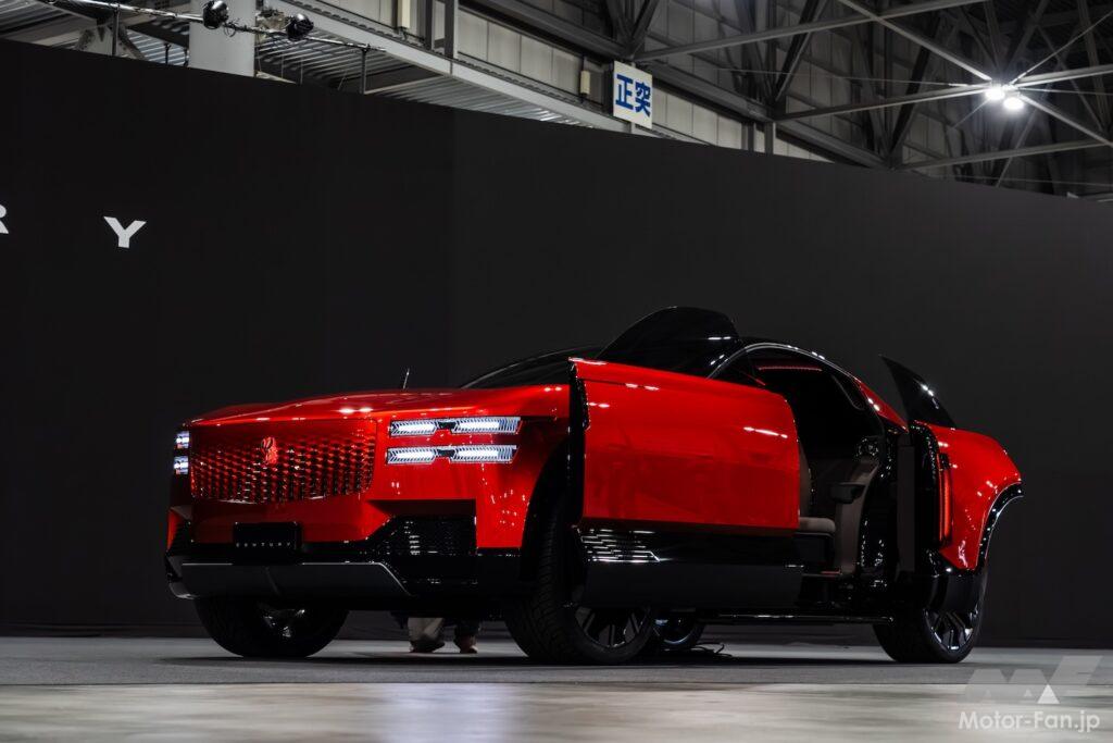 室内空間は2+1のコンセプト。旅客機のファーストクラスのようにフルフラットになるオーナーのスペースが左側にあり、右側は運転席。その後ろにSPや秘書などの乗車を想定した補助シートがある。左側だけ大小ふたつのドアが前後にスライドして大空間を生む仕掛けとなっているのは(右側は通常のヒンジドア)、美しさや快適性の面で乗り降りの所作にもこだわっているから。