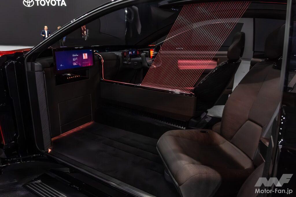 西陣織を採用したシートをはじめ、インテリアは天童木工や輪島の漆塗りなど、日本の伝統工芸を多用。運転席とオーナー席を仕切るパーティションの模様は豊田自動織機が扱っていた糸のイメージ。多分に「日本」を意識した仕立てだ。