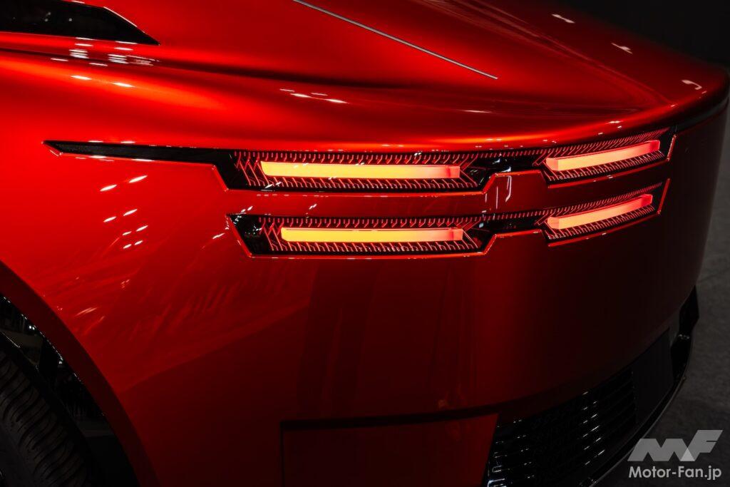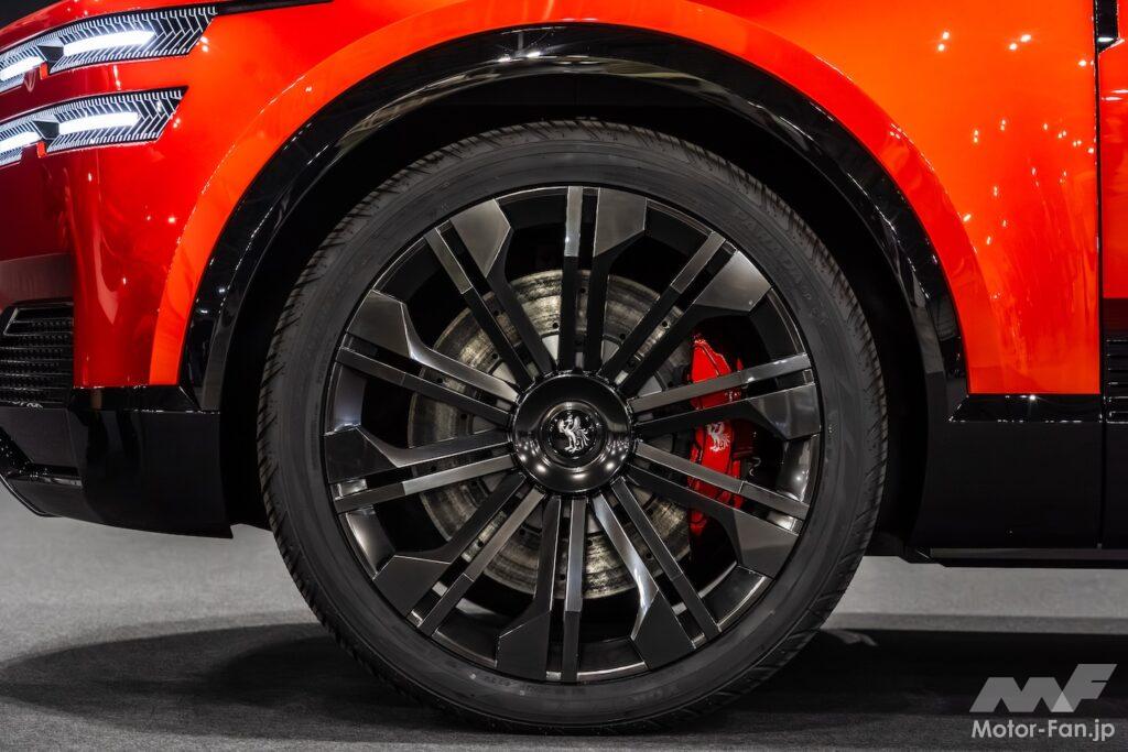 パワートレインに関する発表はないが、長いボンネットの左右にルーバーが配されていることから、V型多気筒エンジンと電動化の組み合わせもあると妄想したくなる。前車軸の後ろにあるブレーキキャリパーはタイロッドが前引きでることを示しており、パワートレイン縦置きレイアウトの定番配置だ。