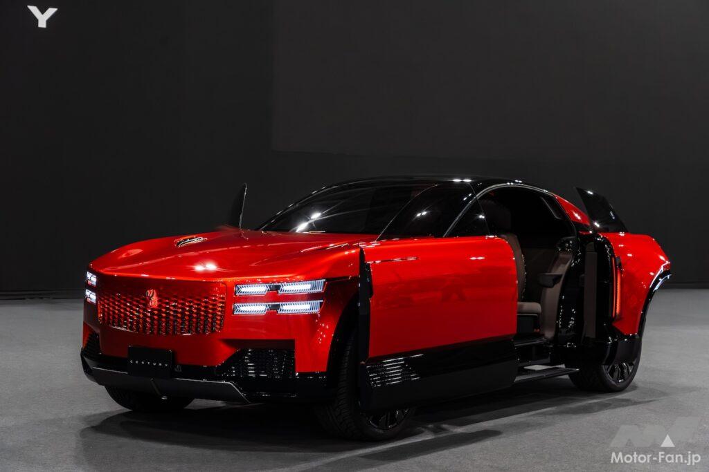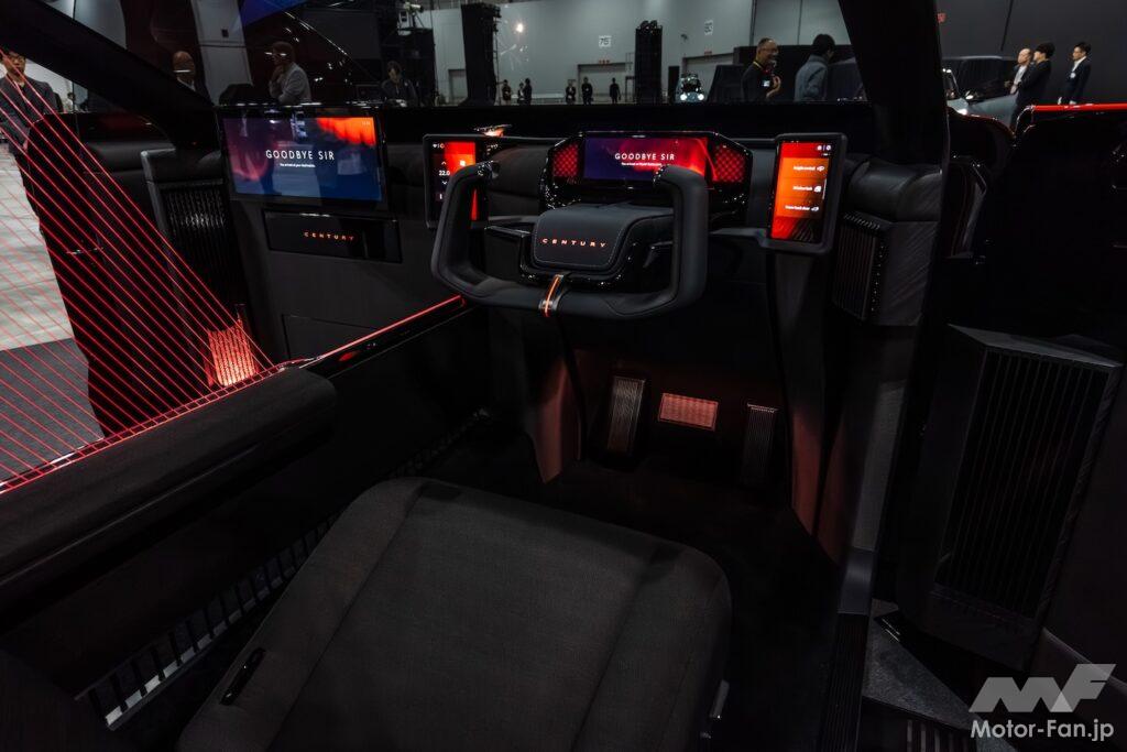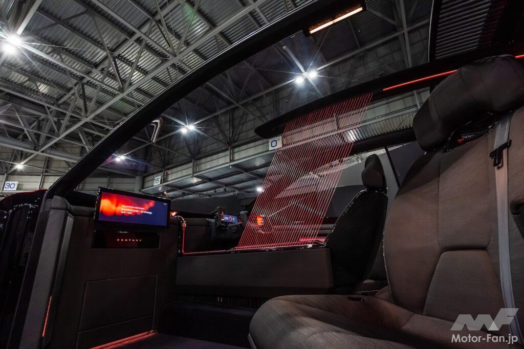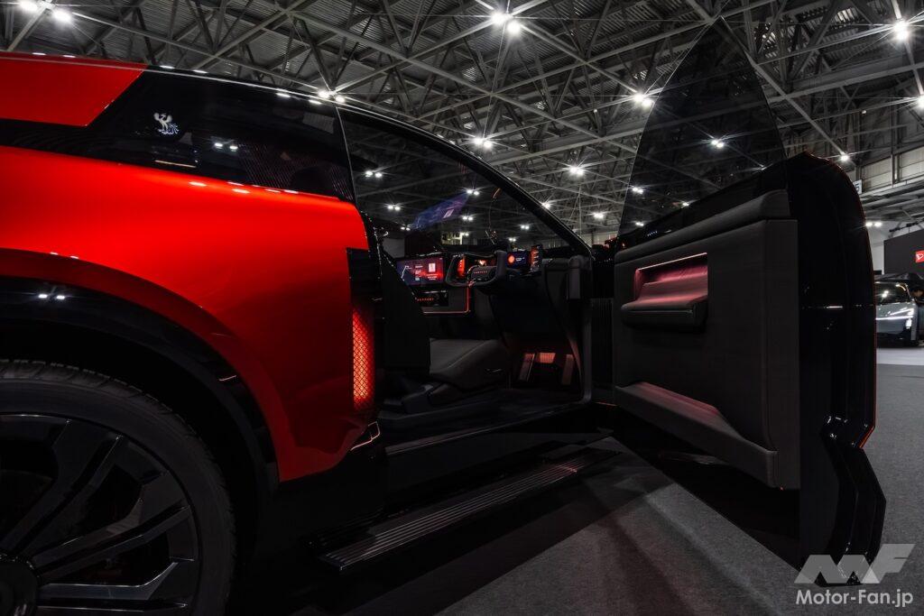 室内空間は2+1のコンセプト。旅客機のファーストクラスのようにフルフラットになるオーナーのスペースが左側にあり、右側は運転席。その後ろにSPや秘書などの乗車を想定した補助シートがある。左側だけ大小ふたつのドアが前後にスライドして大空間を生む仕掛けとなっているのは(右側は通常のヒンジドア)、美しさや快適性の面で乗り降りの所作にもこだわっているから。