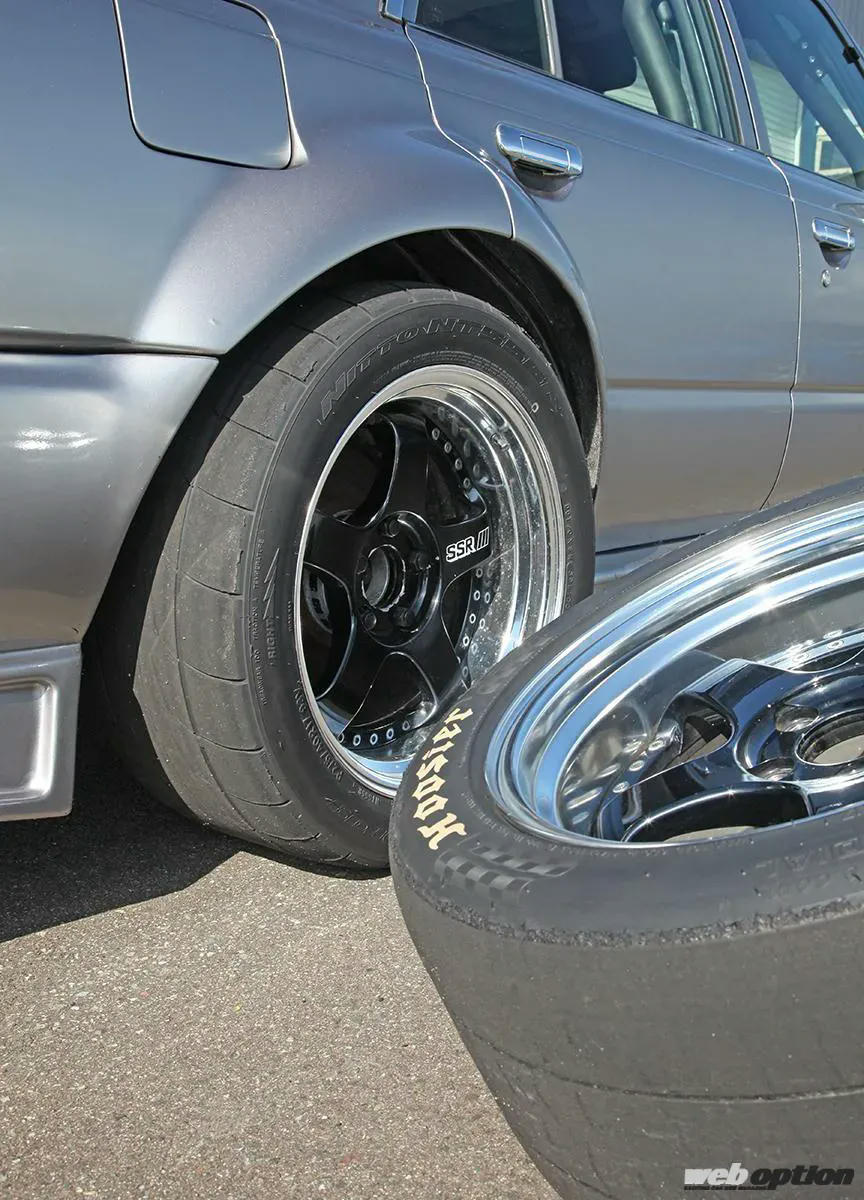 ドラッグレース時はこの足回りにフュージャーのラジアルを組み合わせて勝負に出る。ニットーに比べて扱いやすさの幅があるため、タイムを狙いやすいそうだ。