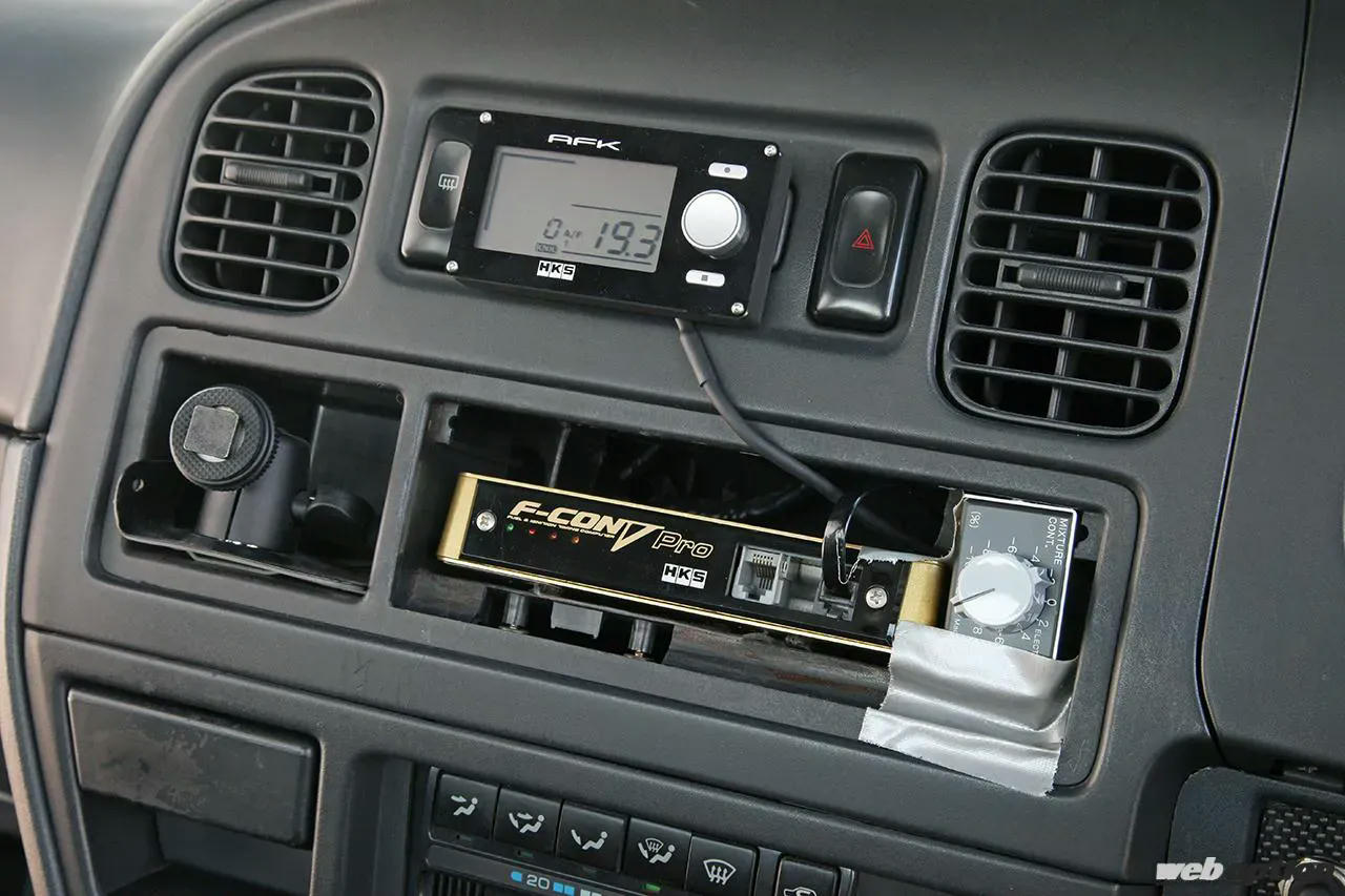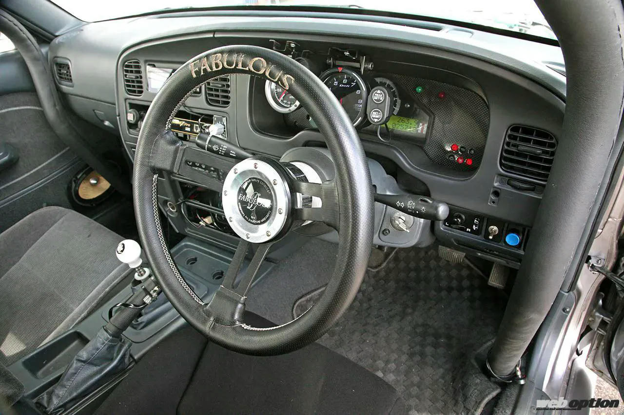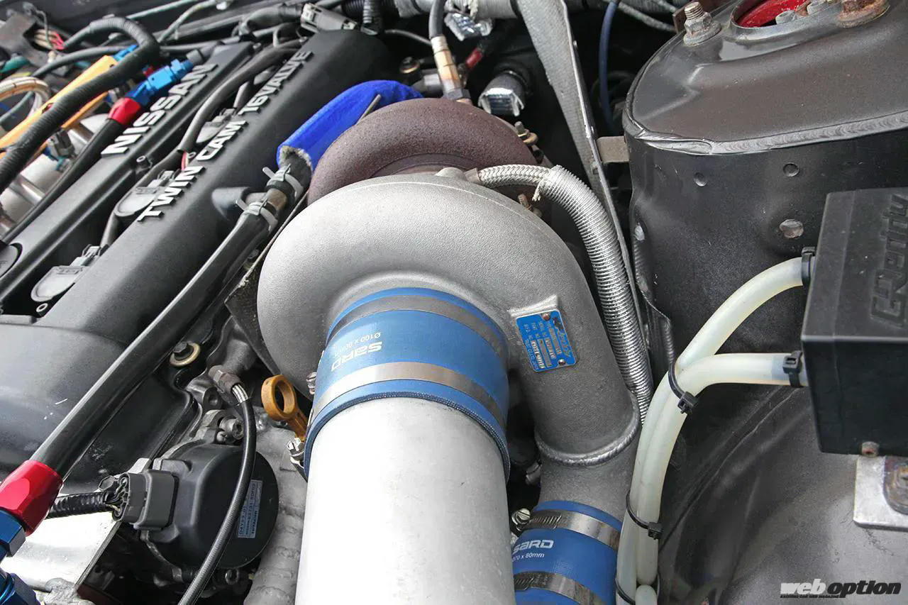 その際にエンジンはSR20DETに載せ換えられ、腰下は2.2Lまでスケールアップ。ヘッドには288度のハイカムを組んだ上、大容量サージタンクやQ45用スロットルでシッカリと吸気できる環境作りを整える。燃料デリバリーはサード製でインジェクターは1000cc×4本だ。