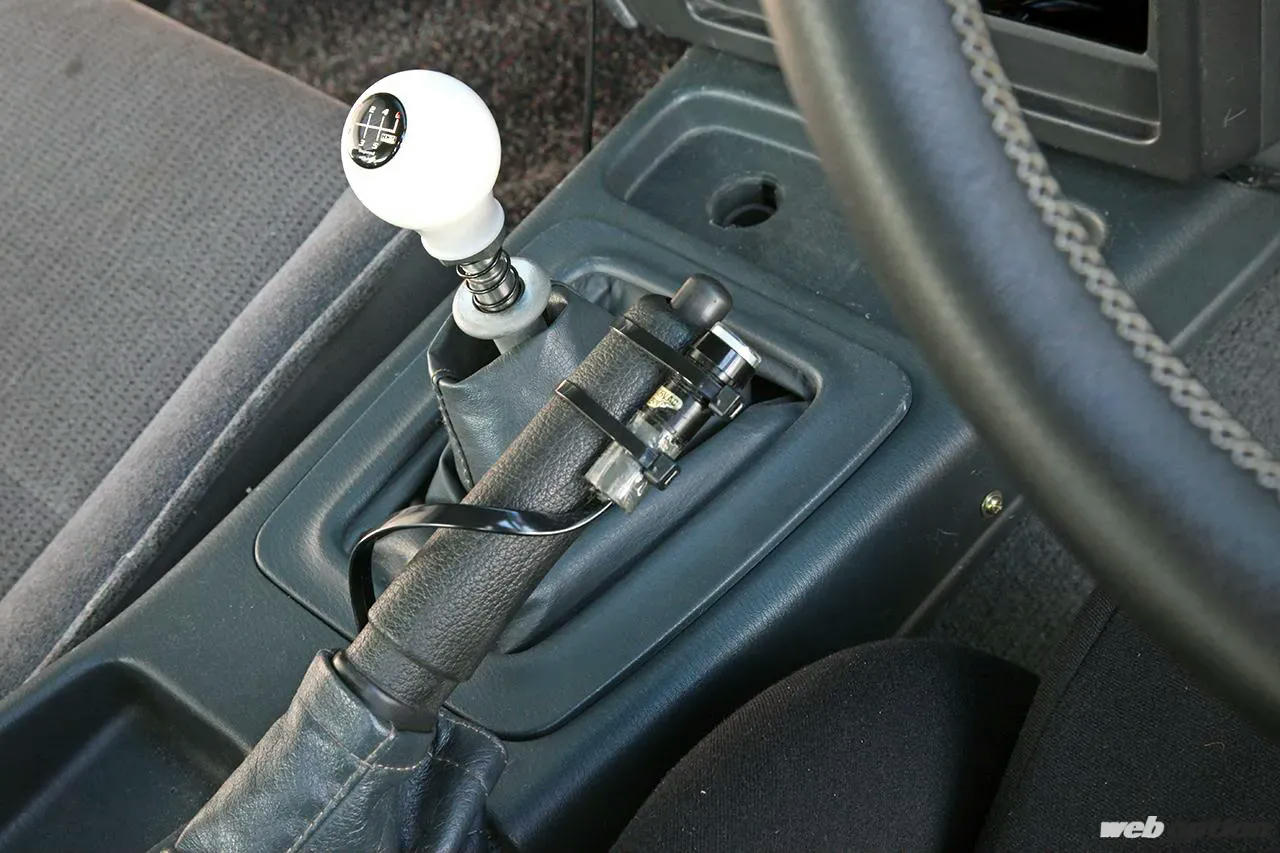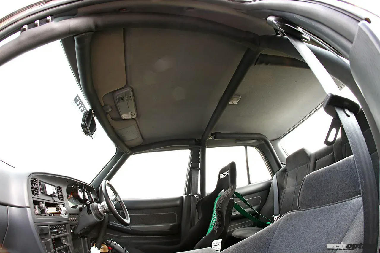 一方の室内は、安全性を考慮しロールバーが組み込まれているが、リヤシートや助手席は純正のまま。運転席側に見えるレバーは、リヤドアを開けるためのオープナー。この車両がタクシーであった証拠だ。サイドブレーキに設けられているのはプロスタートだ。