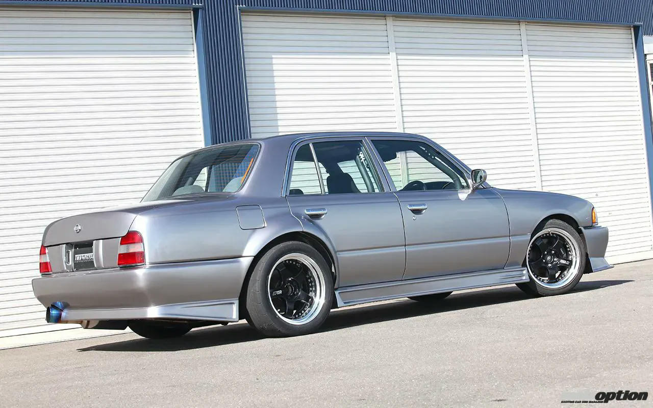 そんなクルーをベースに、過激なドラッグ仕様に仕上げたのは秋田県の“ツーシステム”。C33ベースの加工エアロと、膨らみを持たせたリヤブリスターフェンダーが只者ならぬ雰囲気を醸しているが、この車両は元々4枚セダンを乗りたいと思っていた元オーナー(その後ツーシステムのデモカーになった)が愛車のシルビアでクラッシュしたのを機に、クルーを格安で入手してハコ替えしたものだという。