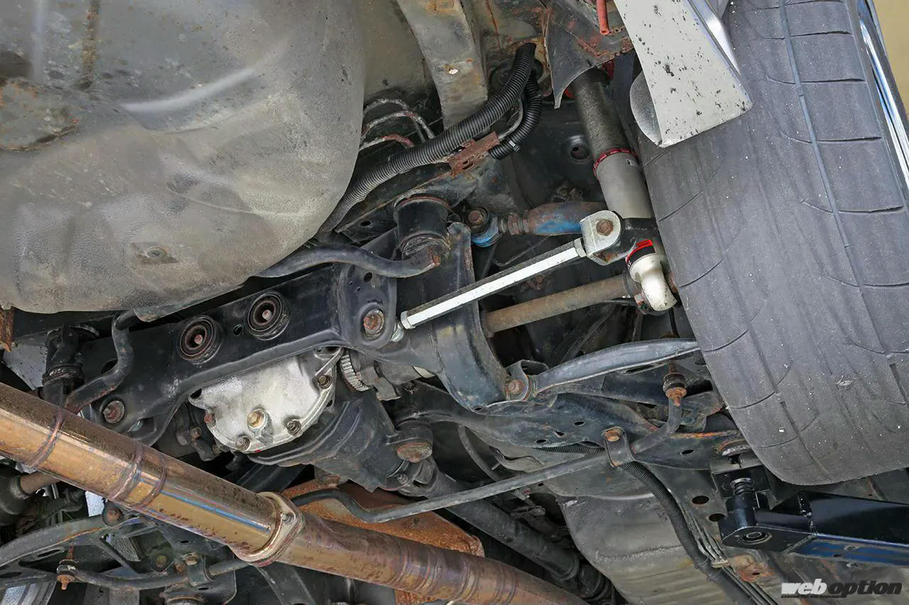 リヤはホーシング式である純正サスペンションをS15用のマルチリンクに変更。アッパーマウント周辺を新設するなど切った貼ったの大手術を行なって、メンバーごとのフル移植を実現している。