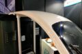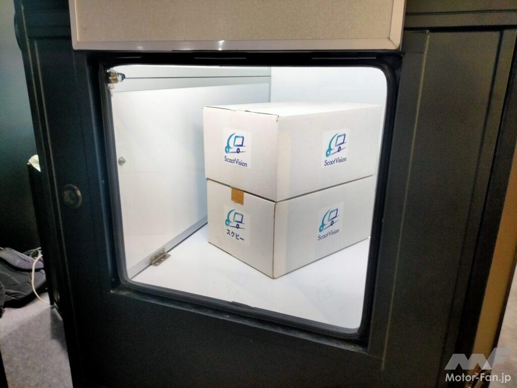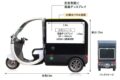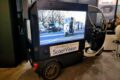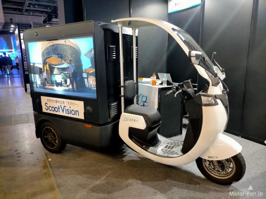 写真は雨風が凌げるルーフ付きの電動バイクに“屋外広告スペース”を設け、荷物運搬用のキャリアカーをドッキングさせたユニークな次世代ビークル「スクビー」。