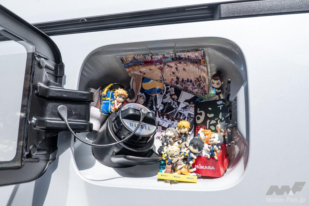 電気系統、オーディオ、ランプ類の装着はじめ、前後エンブレム、ドアミラー、フェイスのラプター塗装、ドアや天井の防振加工も自作。しかもランプ類はどこにも配線が見えない美しさ。これだけ手数が多いにも関わらず、スッキリと美しくゴテゴテして見えないのはまさにセンスの賜物。ボンネット両端に装着の「×」デザインが斬新なNOVSIGHT製ランプはアクセントにピッタリ!