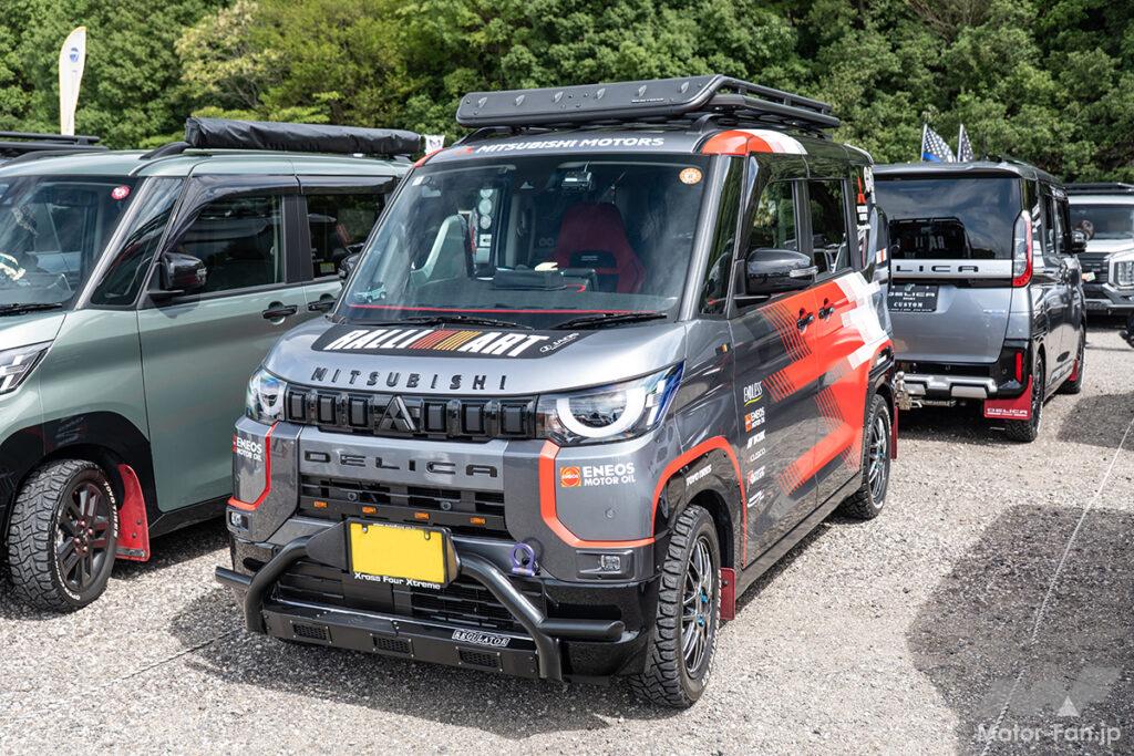 ディスプレイ業を営む池ちゃんさんはオートクルーズ機能のあるこのデリカミニが大のお気に入り。カスタムコンセプトはズバリ、2022年の三菱トライトンのラリーアート。純正のチタニウムグレーメタリックのボディに、黒×白×赤の三菱カラーを使用。作業はラッピング業を営む友人に手伝ってもらいつつ、会社の倉庫で少しずつ施工。この世界観を見事に再現した。外観はオートフラッグスのフロントガードに、ランドリックのグリルマーカー、バスターズミニのルーフラックで雰囲気満点の仕上がり。室内はシートカバーにハセプロ、アルパインのオーディオ類。今後はリフトアップも視野に入れているとのことだ。