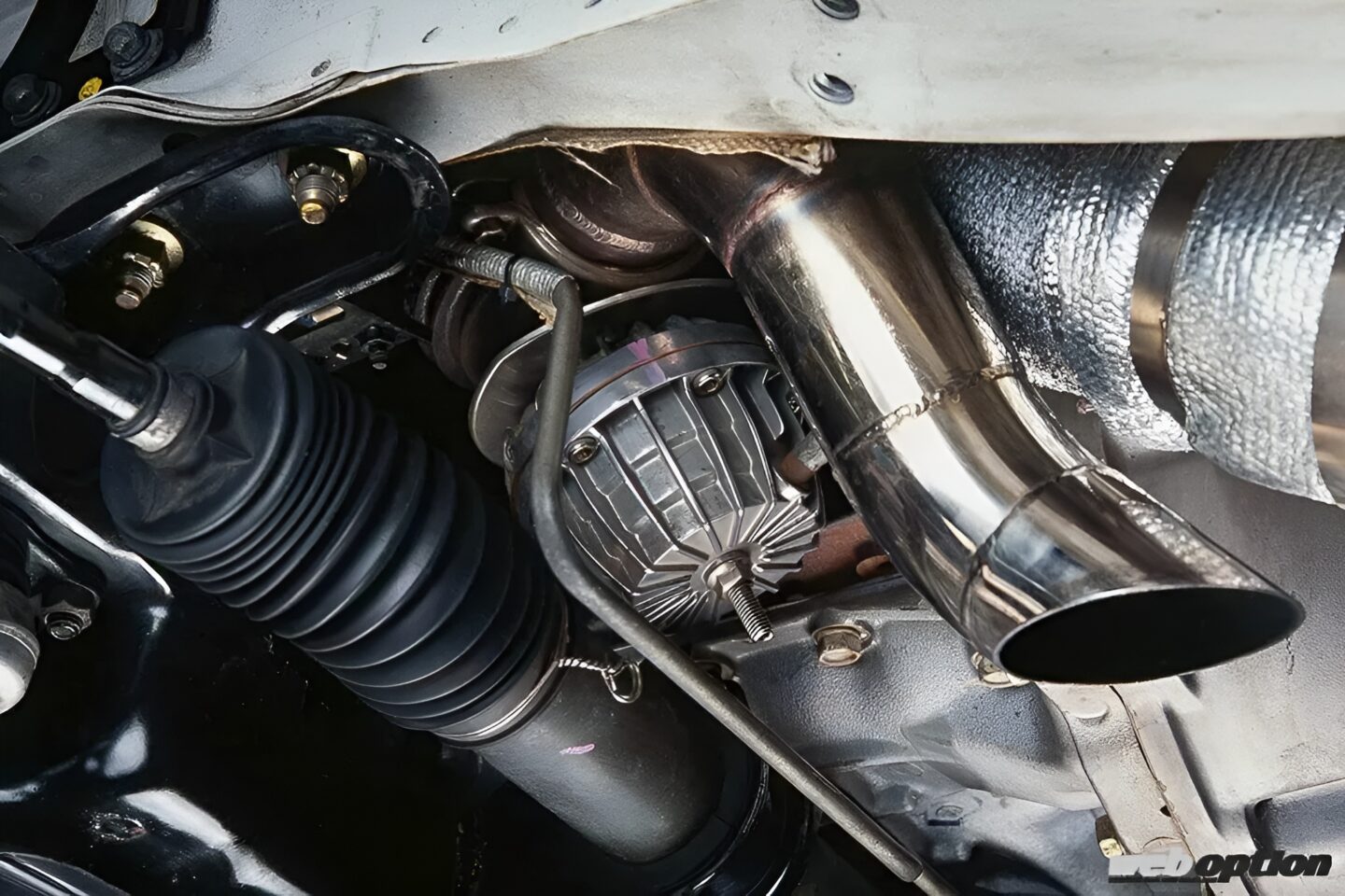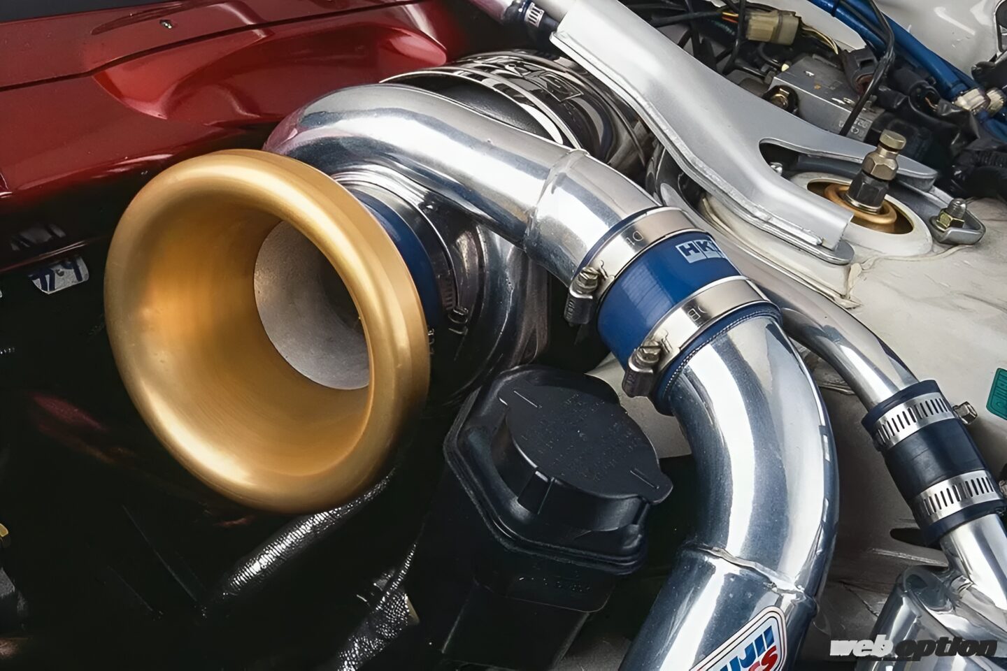タービンはTO4Rを選択。エンジン回転の上昇と共にブースト圧が高まる、リニアなパワーフィールが身上のシングルターボ/ウエストゲート仕様だ。パワーバンドが4000rpm以上のため、中速トルクに若干の物足りなさを感じるが、8000rpmまで衰えないパワー感はポン付けタービンでは味わえないもの。