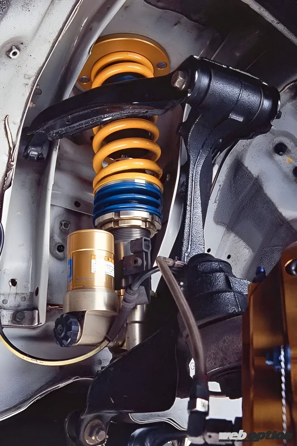 サスペンションはダンパーに別体式タンクを備えたオーリンズ車高調でセットアップ。この足はダンパーロッド先端のダイヤルで伸縮両方向の全体的な減衰力を調整、タンクに付いたダイヤルで縮み側の減衰力だけを調整できるシロモノだ。