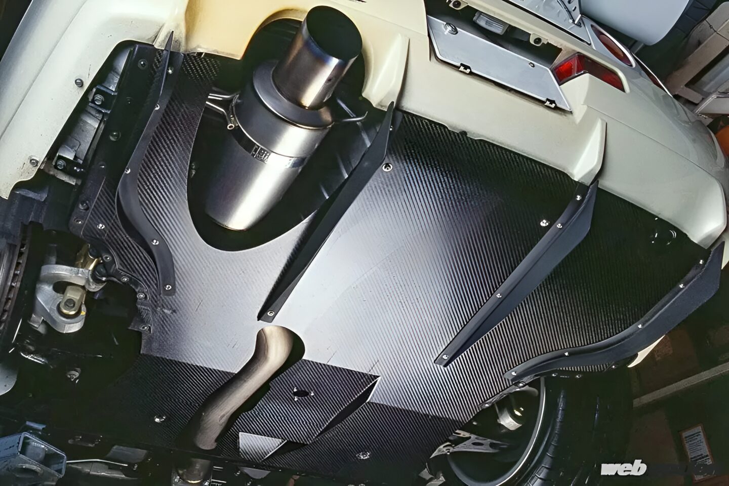 高速域でダウンフォースを生み出すリヤアンダーディフューザーは、垂直板が純正よりもサイズが大きいニスモのカーボン製に交換される。マフラーはアペックス製でメインパイプ95φ、テール115φだ。