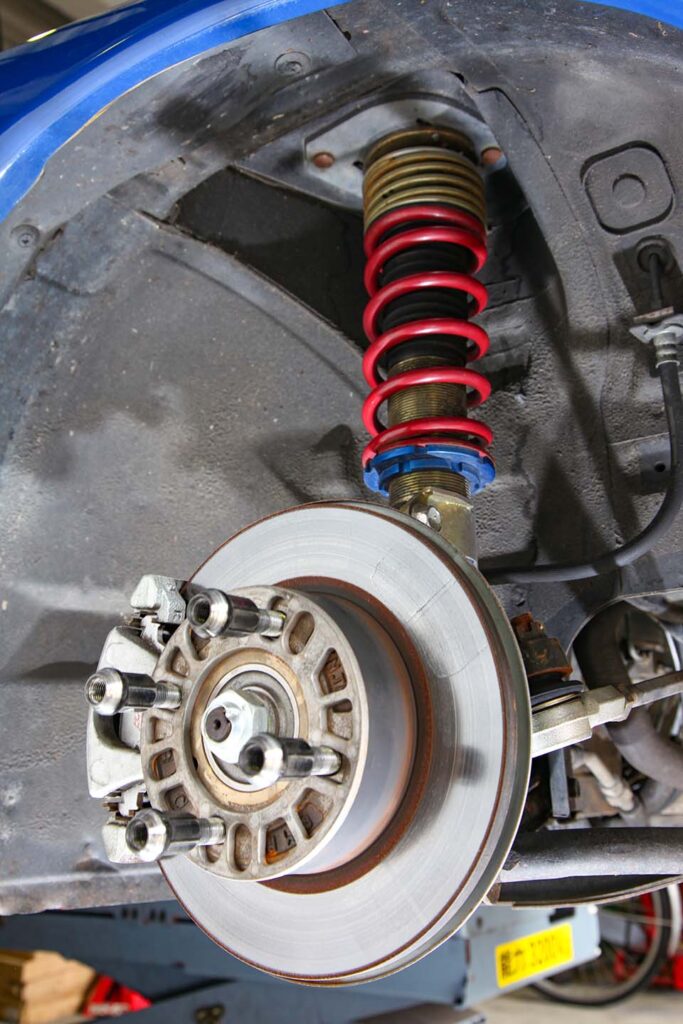 車高調はジムカーナ向きのセッティングが施されたオーリンズ製。ブレーキはウィンマックス製パッドで強化される。また、4穴ホイールの選択肢を増やすため、アルトワークス純正ハブを流用してPCDを114.3から100に変更している点にも注目だ。